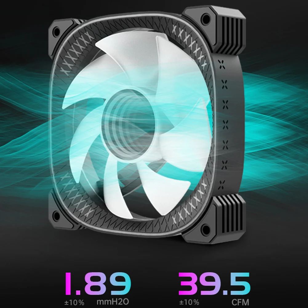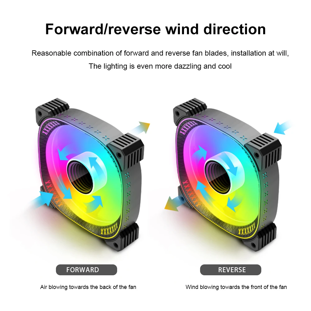 2. Rotación inversa y delantera:Elija entre hacia adelante (soplando aire hacia la parte posterior del ventilador) o rotación inversa (soplando aire hacia la parte delantera del ventilador). Las aspas del ventilador del enfriador de enfriamiento de la caja de PC están diseñadas para complementar la lente transparente, lo que permite una mejor visualización sin la obstrucción de los soportes del ventilador y creando un efecto de iluminación visualmente atractivo y fresco.