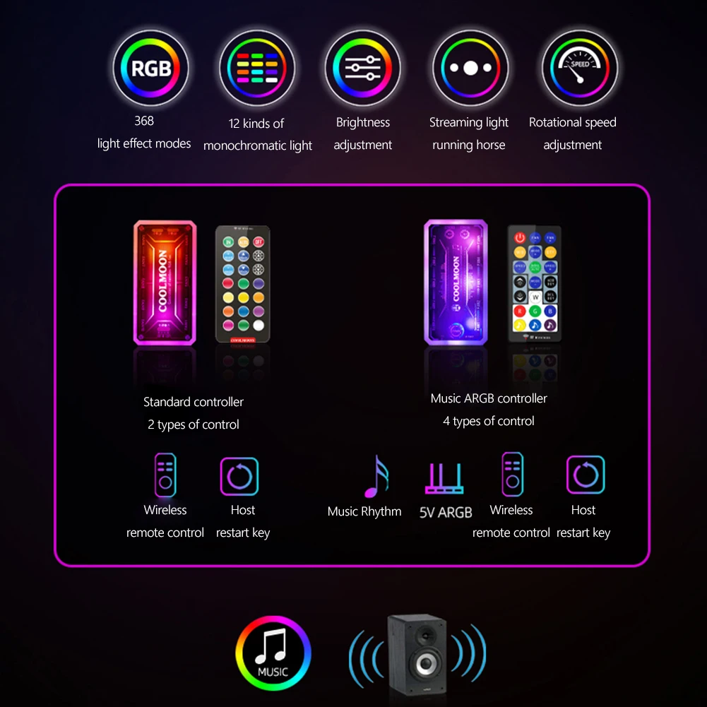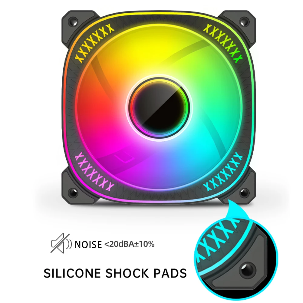 4. Efectos de iluminación de color real ricos y vibrantes:Con anillo exterior e iluminación del eje, combinado con el controlador de música de 6 pines de COOLMOON, el ventilador logra efectos ARGB de color verdadero. Incorpora 16 + 10 LEDs ARGB de alta densidad y alto brillo, soportando 16,8 millones de colores para una iluminación impresionante, suave y vibrante sin ninguna fuga de luz.