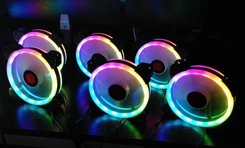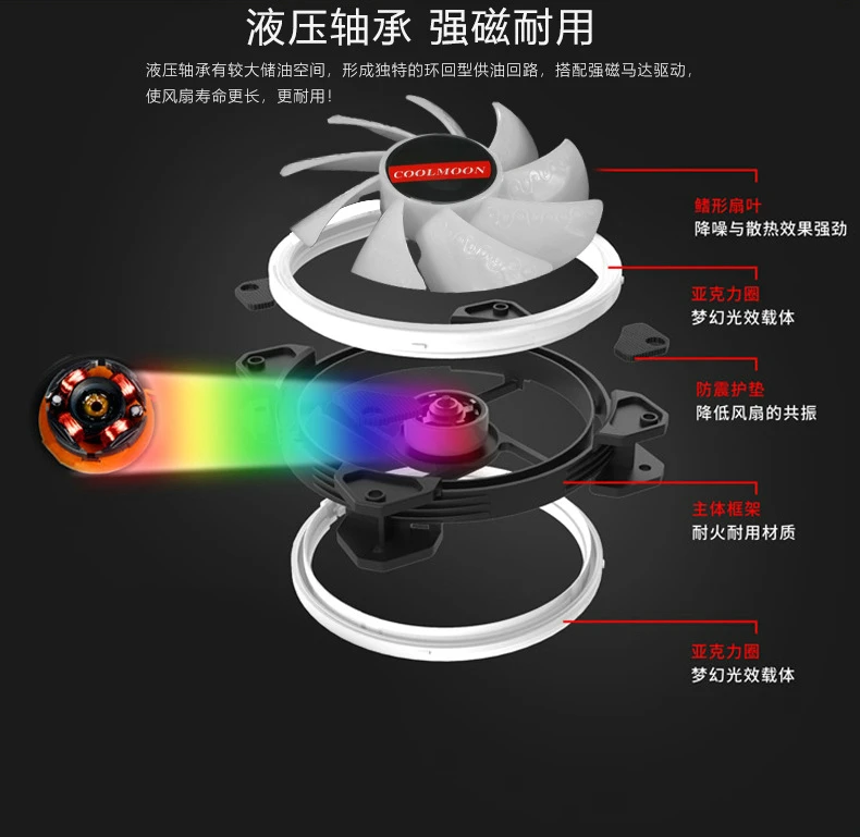 Este ventilador RGB de 120mm tiene una interfaz de 6 pines. Debe usarse con el controlador Coolmoon.