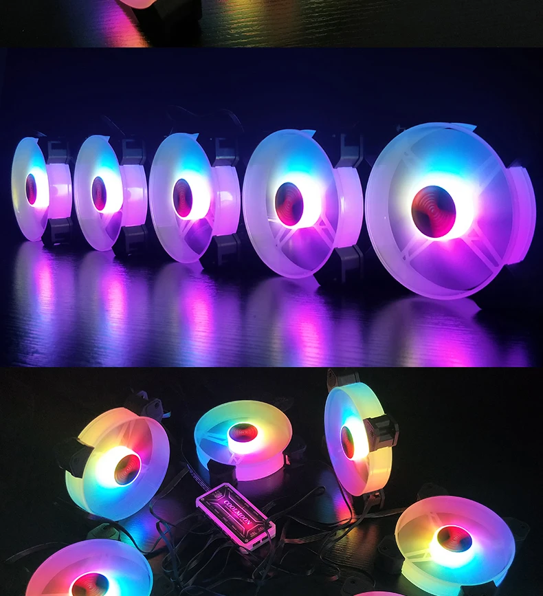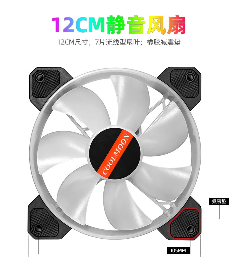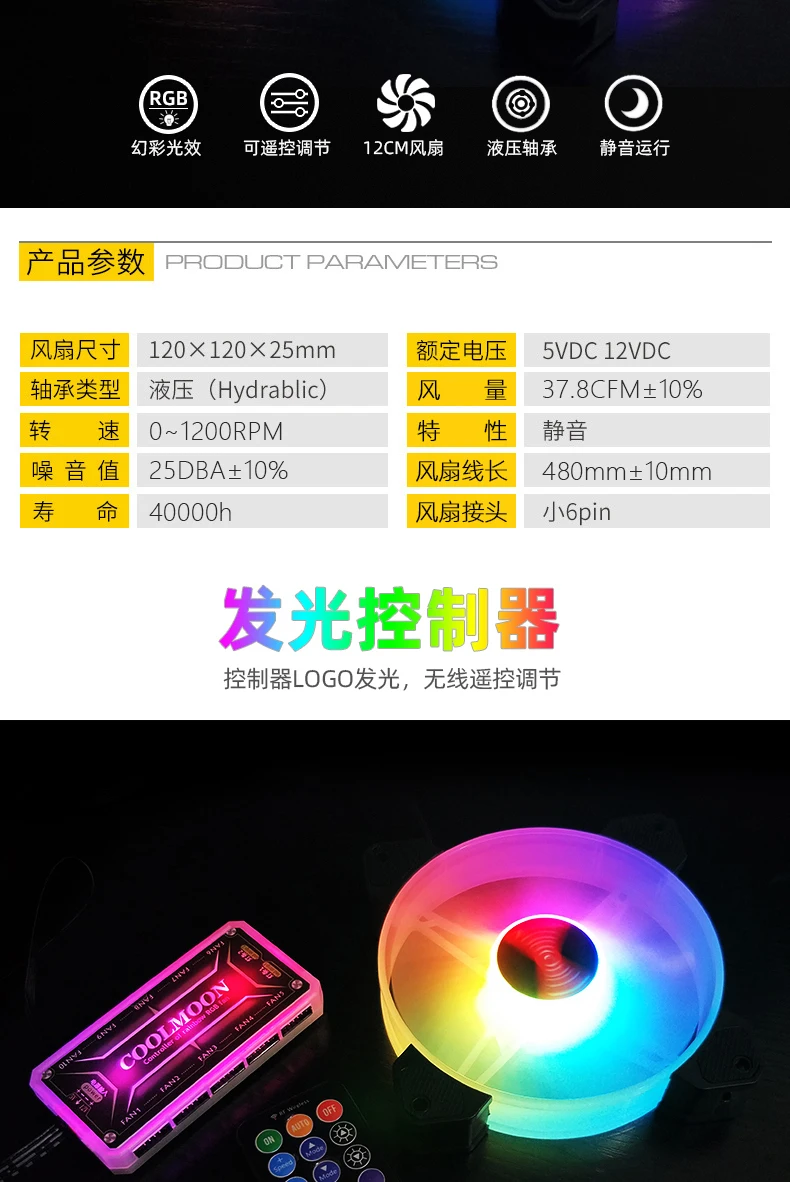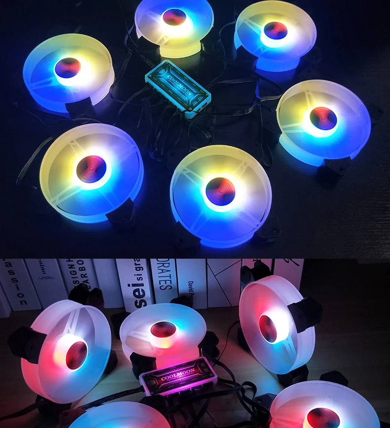 Este ventilador RGB de 120mm tiene una interfaz de 6 pines. Debe usarse con el controlador Coolmoon.