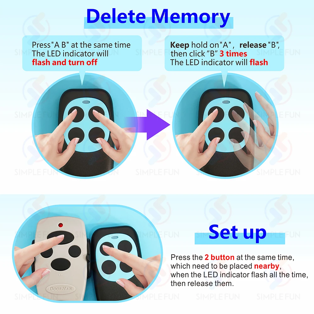 2.Mantenga presionado un botón en su control remoto original y luego presione y mantenga presionado un botón en su control remoto clonado.Continúe presionando hasta que el LED parpadee 2 (Nota: el LED 2 parpadea para no soltar el botón) Luego, 3 parpadea y luego permanece fijo y se ha clonado con éxito.(cada botón sigue la misma operación anterior)