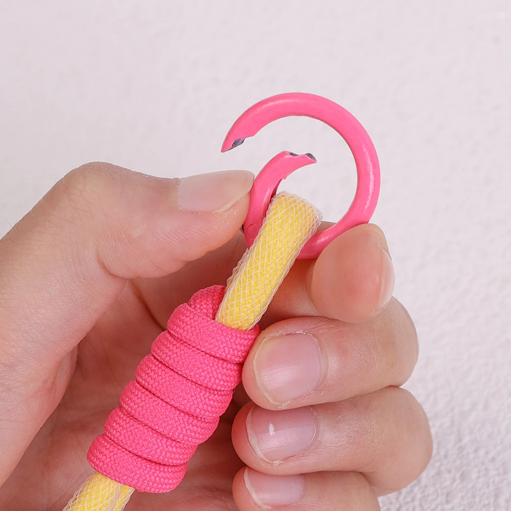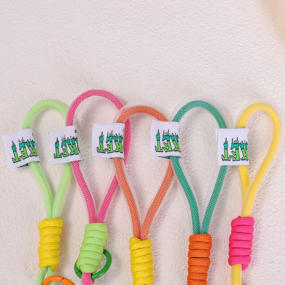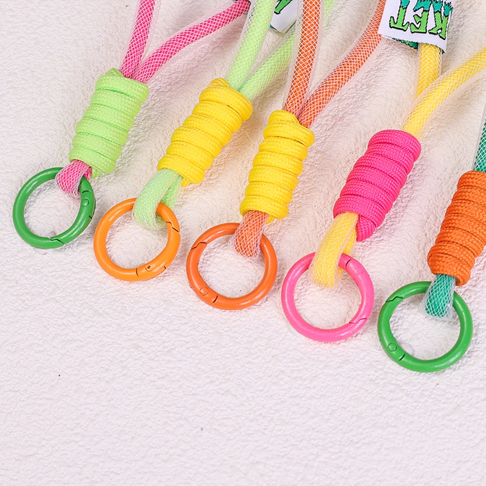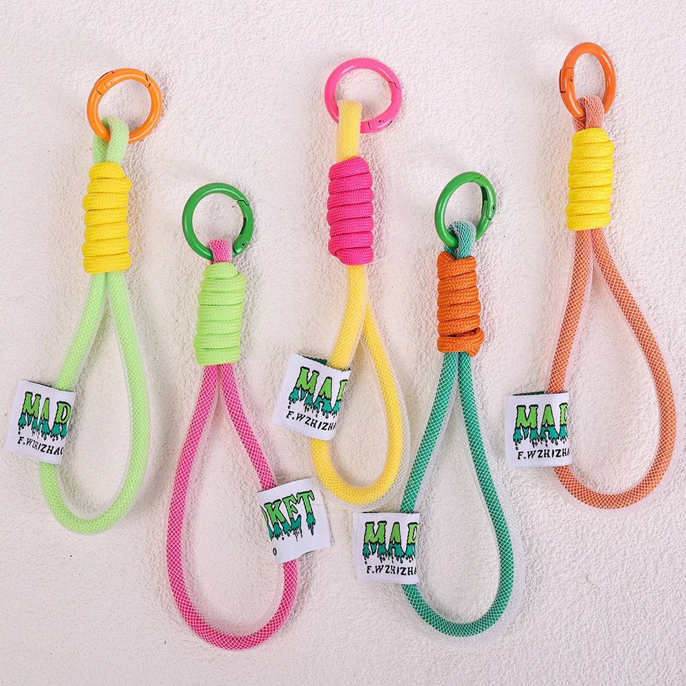 Descripción: Pequeño y portátil, una amplia gama de aplicaciones, se pueden decorar bolsas, mochilas escolares, llaves, cordón de teléfono móvil, etc. Decoración colgante de cuerda de malla de color fluorescente con botón de doble color, colgante de cuerda trenzada para bolso
