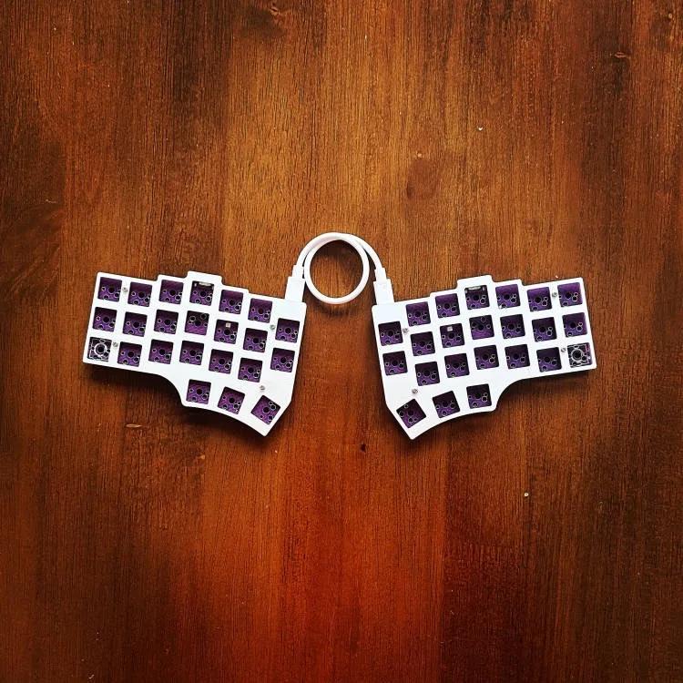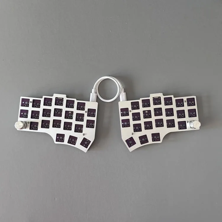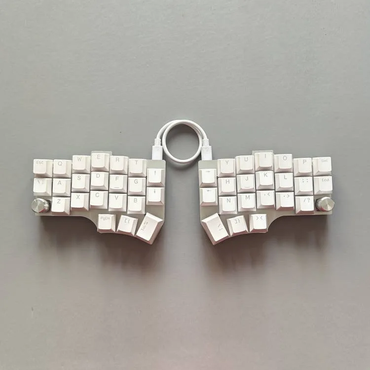 1. A wired single-mode split keyboard with CORNE V4 layout is adopted, and the circuit and structure are reconstructed. A type C wire that supports hot plugging is used to connect the left and right split keyboards, and an aluminum fixed aluminum bottom structure is provided. Two models are available for selection: knob V4e and knob free V4s