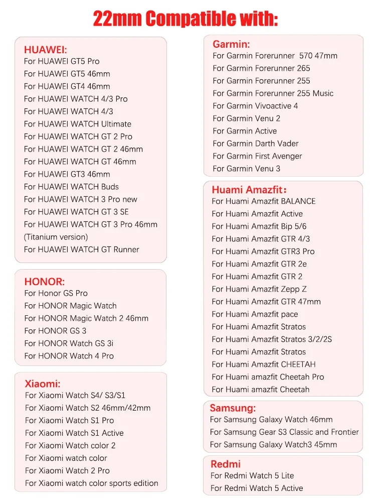 Este producto viene en dos tamaños: 22 mm y 20 mm.Si no estás seguro del tamaño del reloj, puedes elegir el tamaño según los siguientes modelos.