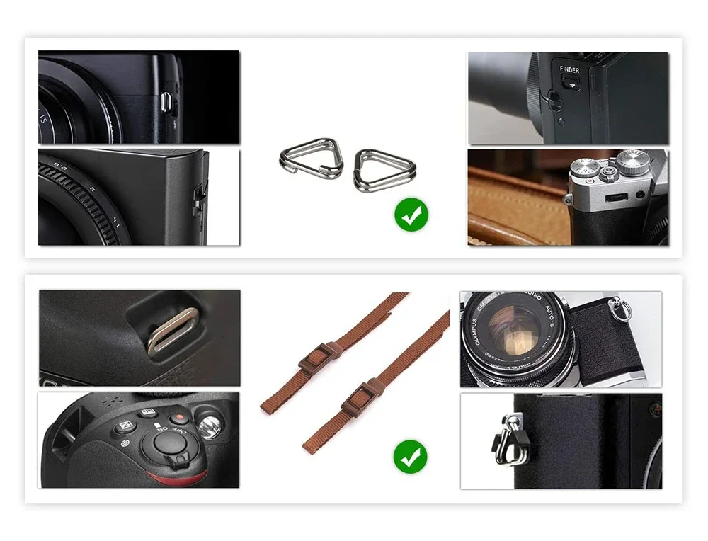 [Sujeta todas las cámaras y NO SOLO para las cámaras] La última versión mejorada es con un triángulo de metal que hace que la correa sea perfecta con seguridad y perfectamente compatible con todas las marcas de cámaras DSLR como Canon, Fuji, nikon, Olympus, Panasonic, Pentax, Sony, Instax, Polaroid, etc., mientras que se puede utilizar para otros equipos como algunos Binoculares, monoculares, telémetros, herramientas, etc.