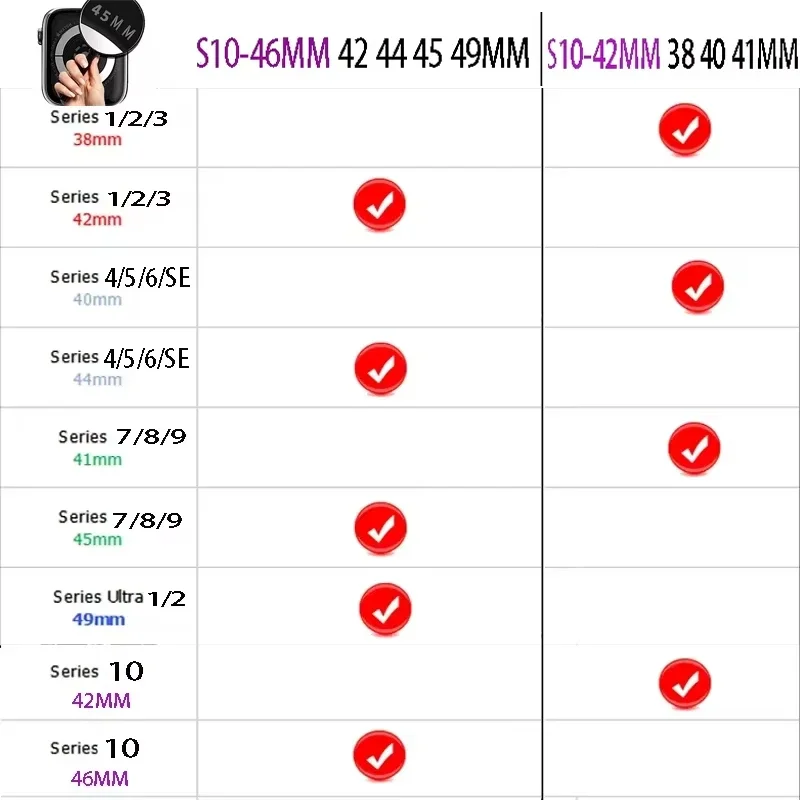1.Serie 10 46 mm=Serie Ultra/Ultra 2 49 mm=Serie 9/8/7 45 m=Serie 6/5/4/SE 44 mm=Serie 3/2/1 42 mm
