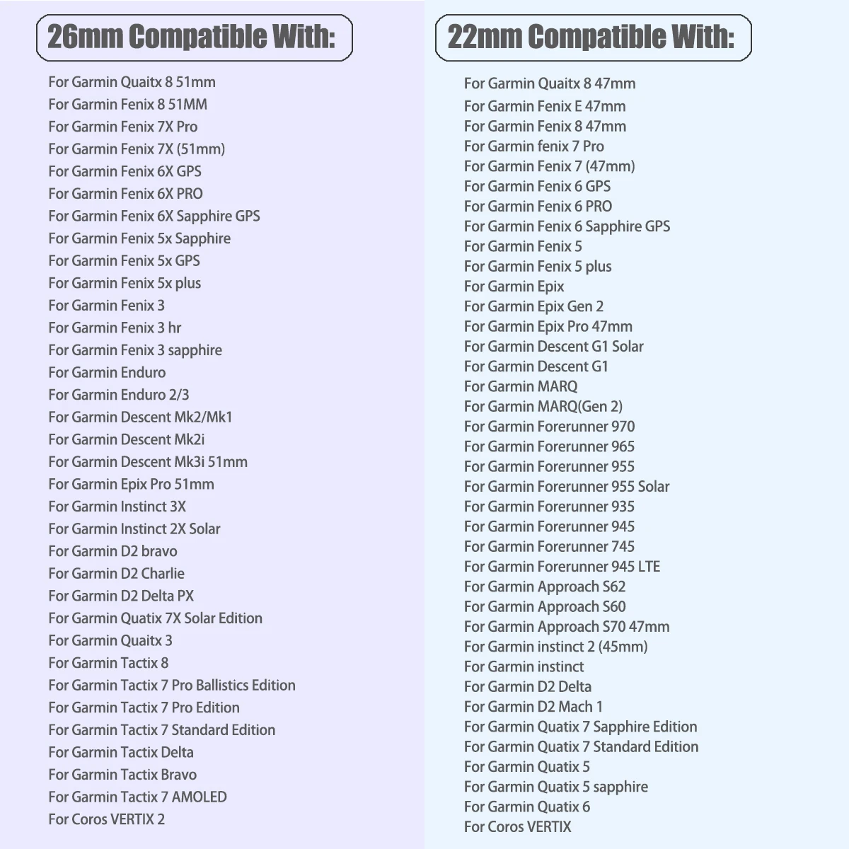 Este producto viene en dos tamaños: 22 mm y 26 mm.Si no estás seguro del tamaño del reloj, puedes elegir el tamaño según los siguientes modelos.