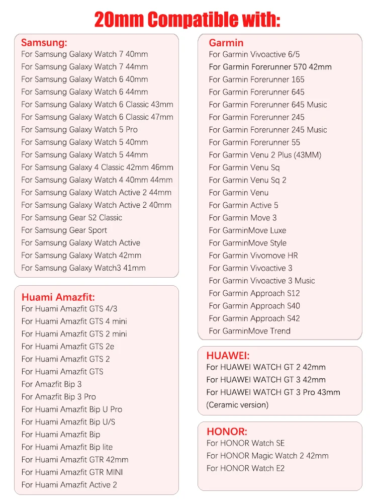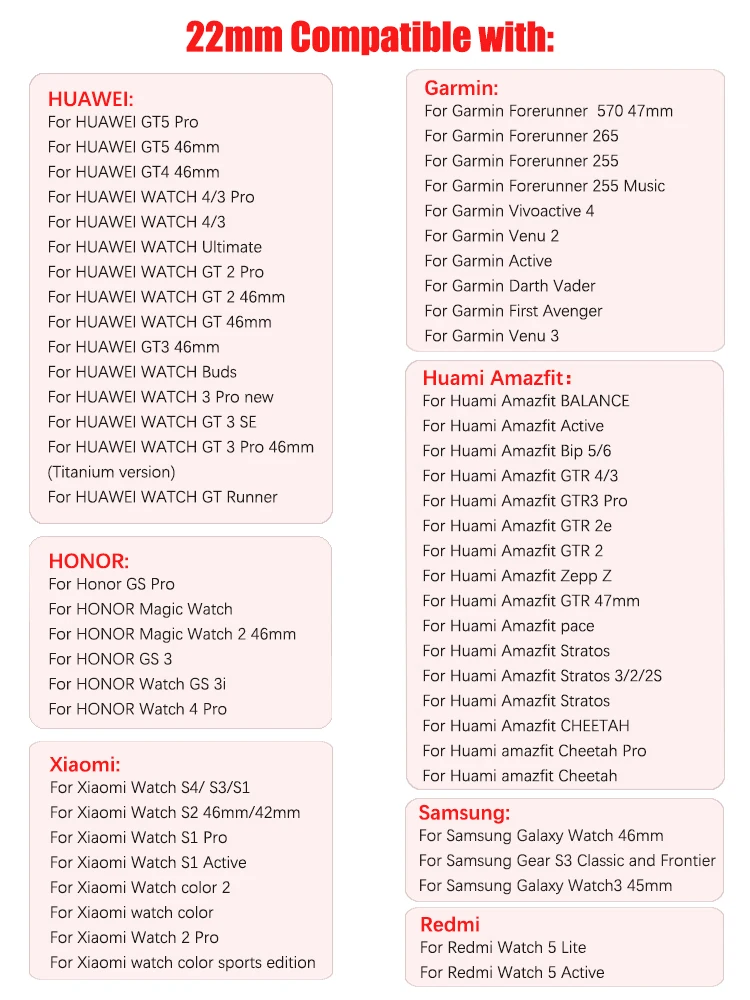 Este producto viene en dos tamaños: 22 mm y 20 mm.Si no estás seguro del tamaño del reloj, puedes elegir el tamaño según los siguientes modelos.