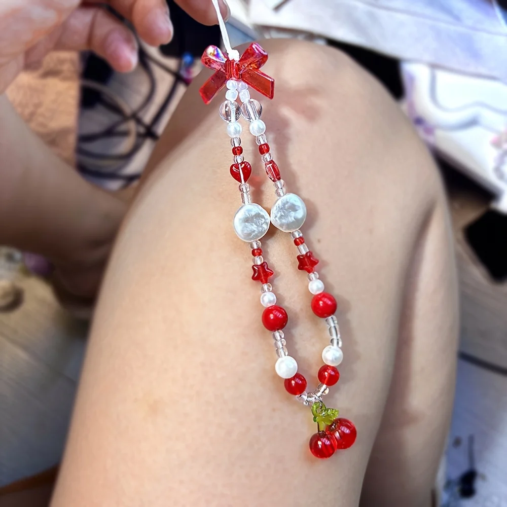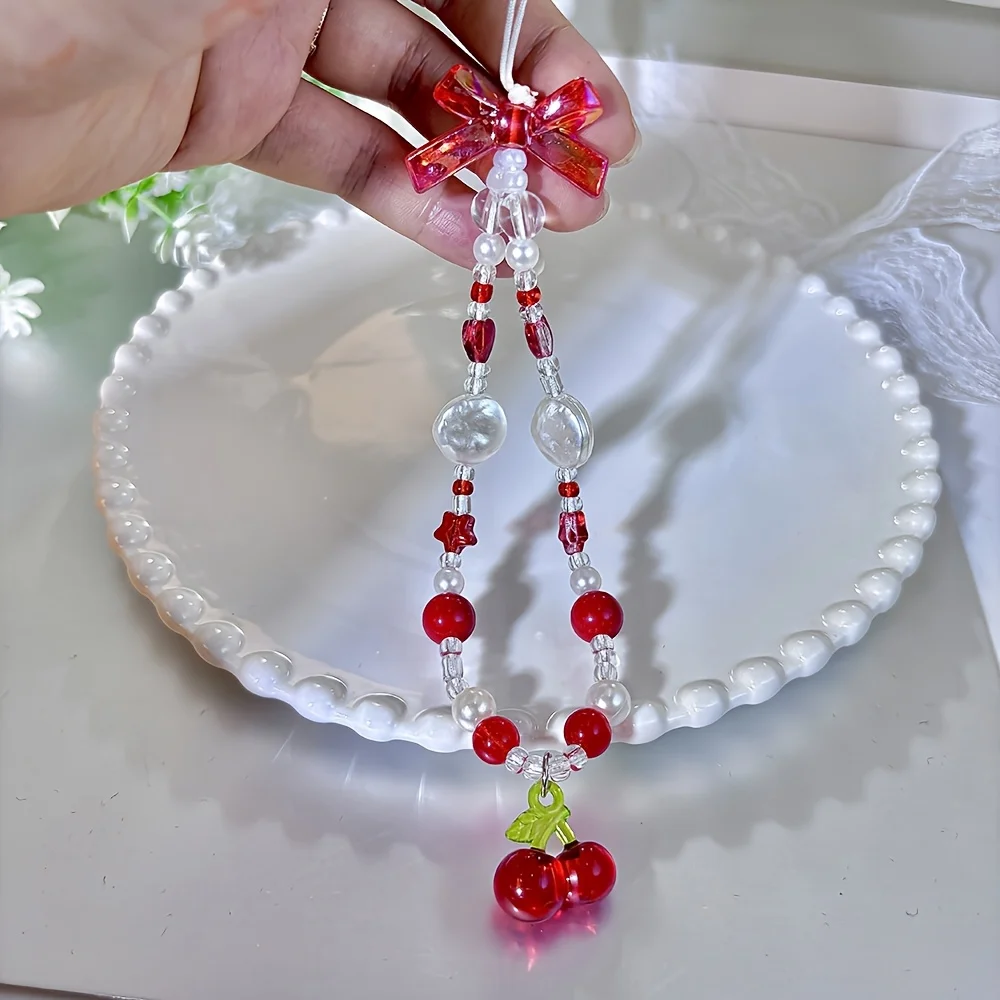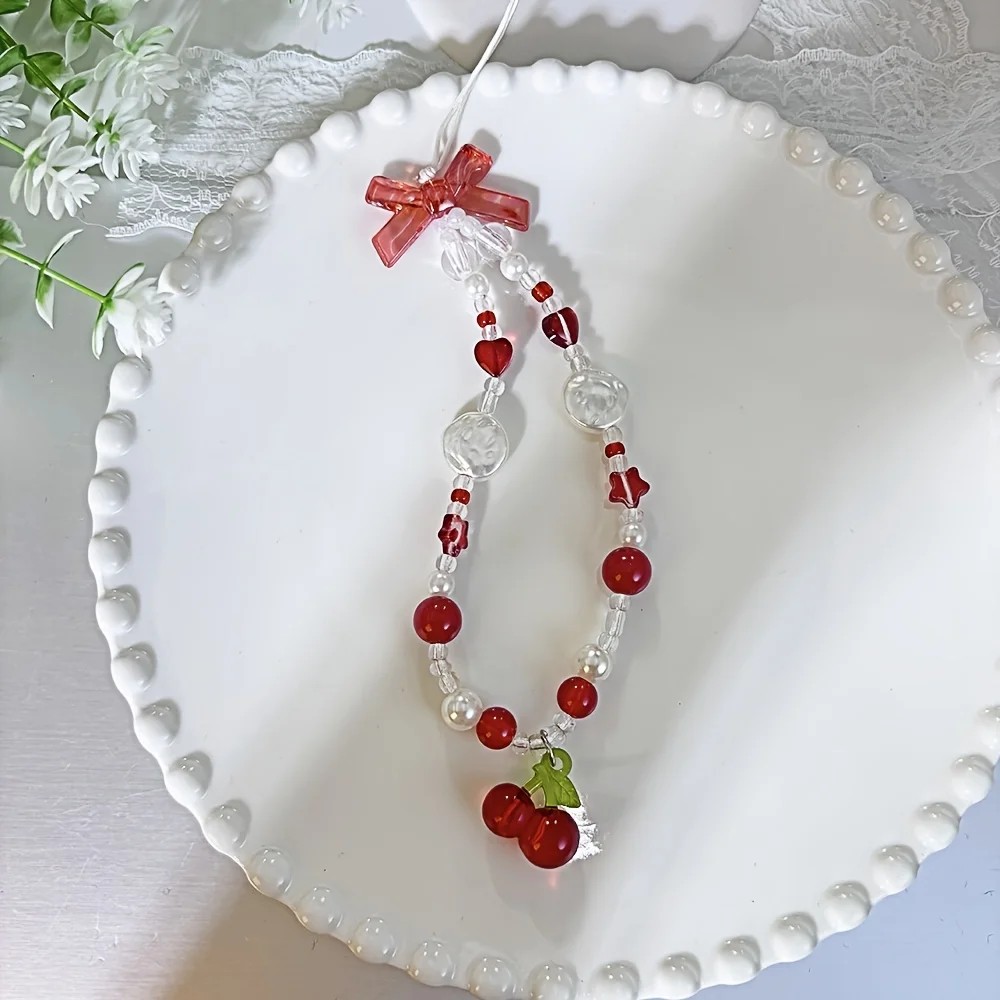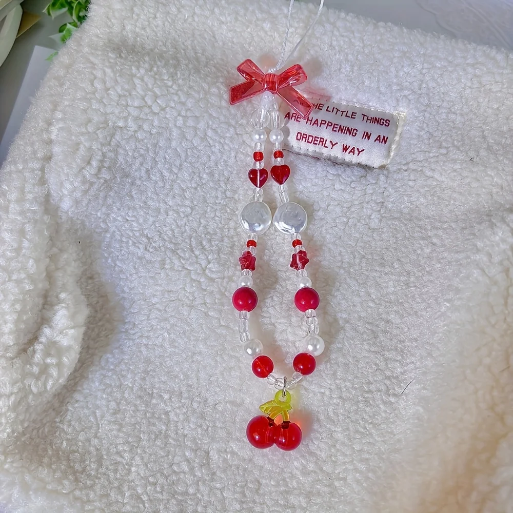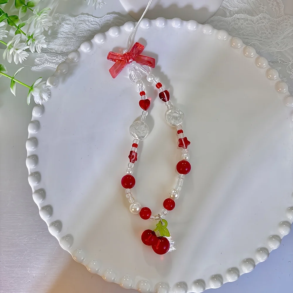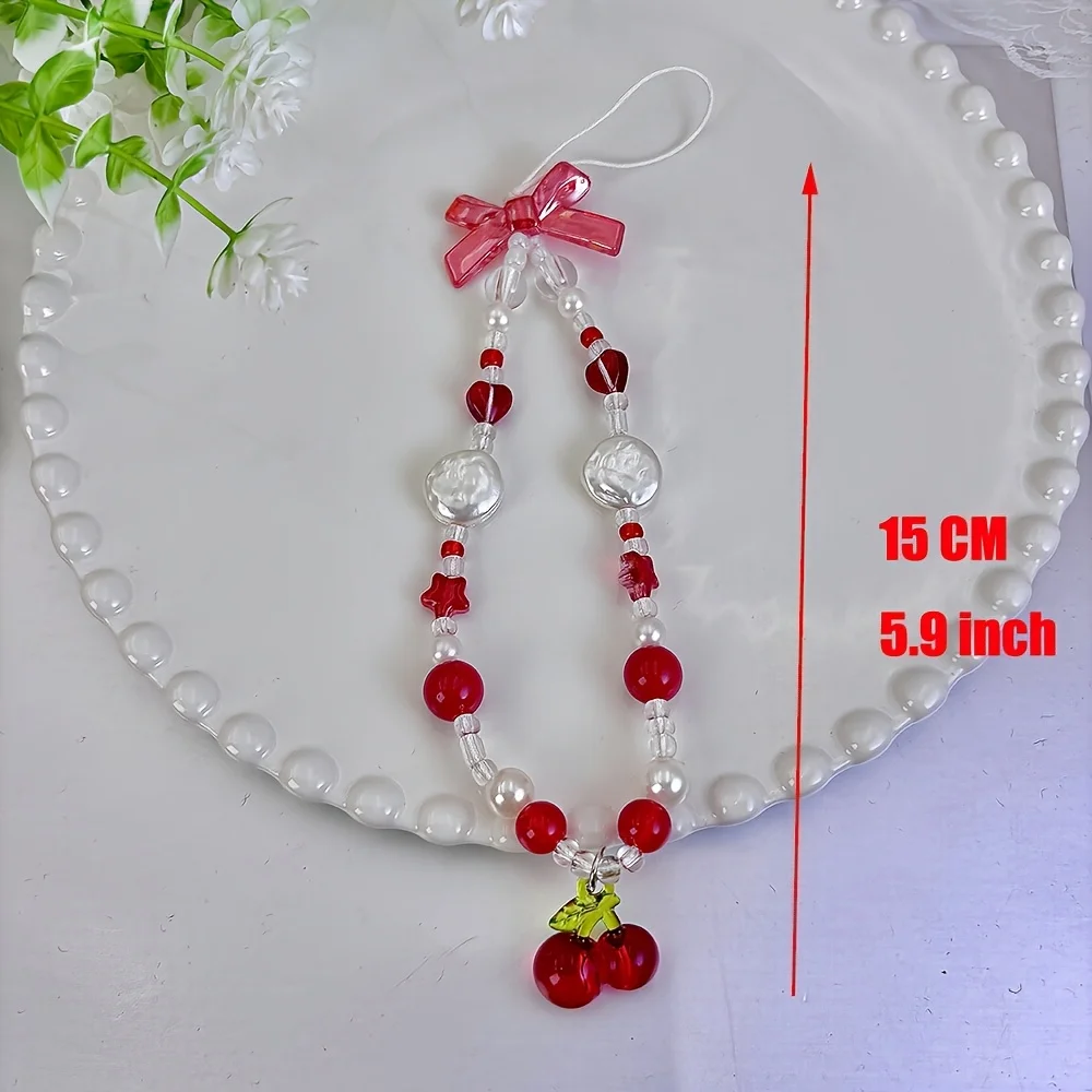Comprar Correa de teléfono con cuentas de corazón y lazo rojo cereza, bonito cordón DIY para cámara o dispositivo móvil, estilo de moda de ocio