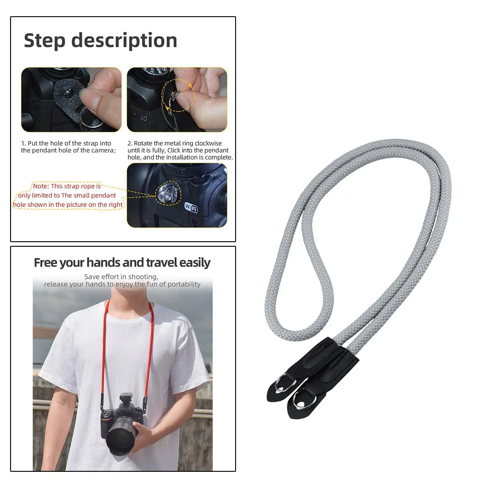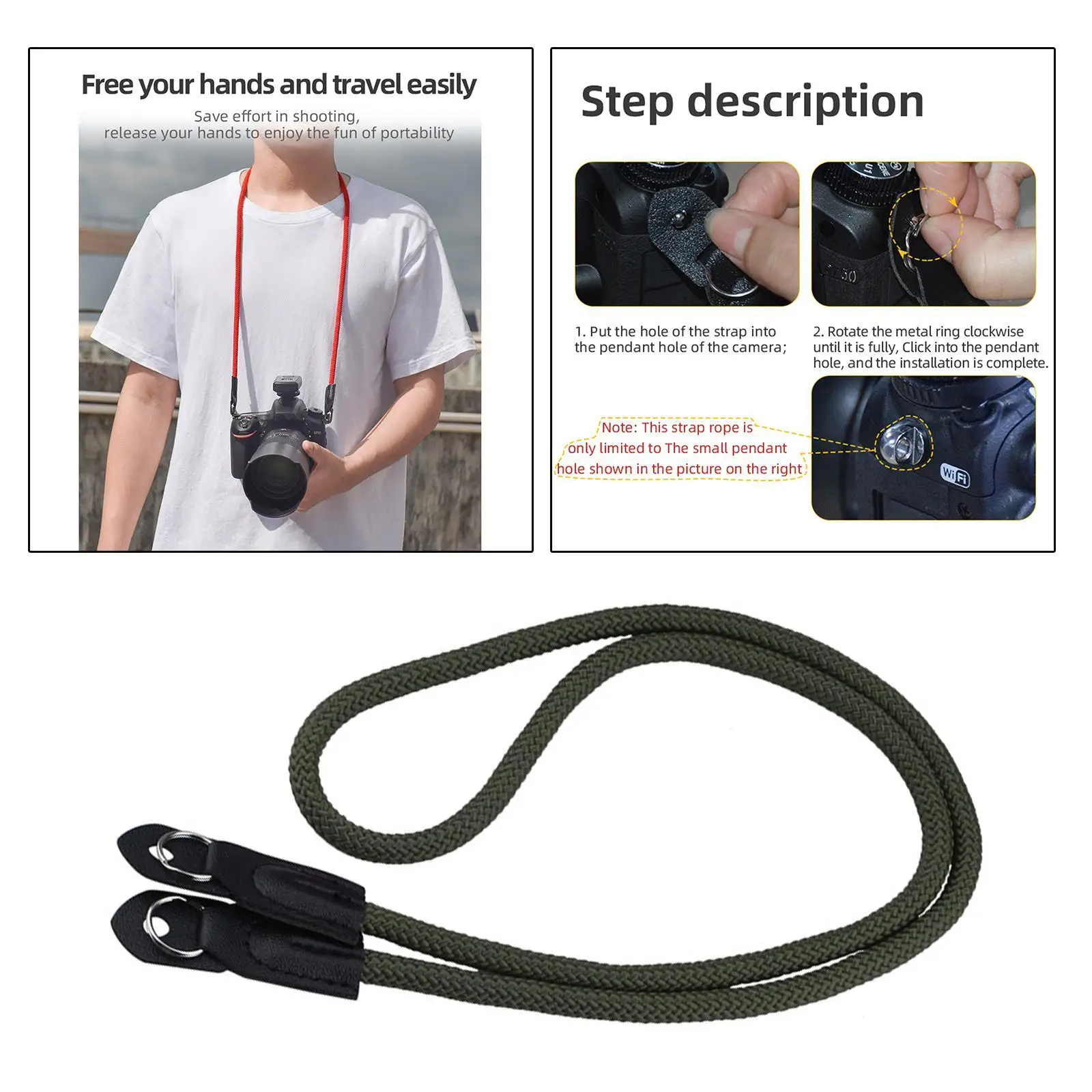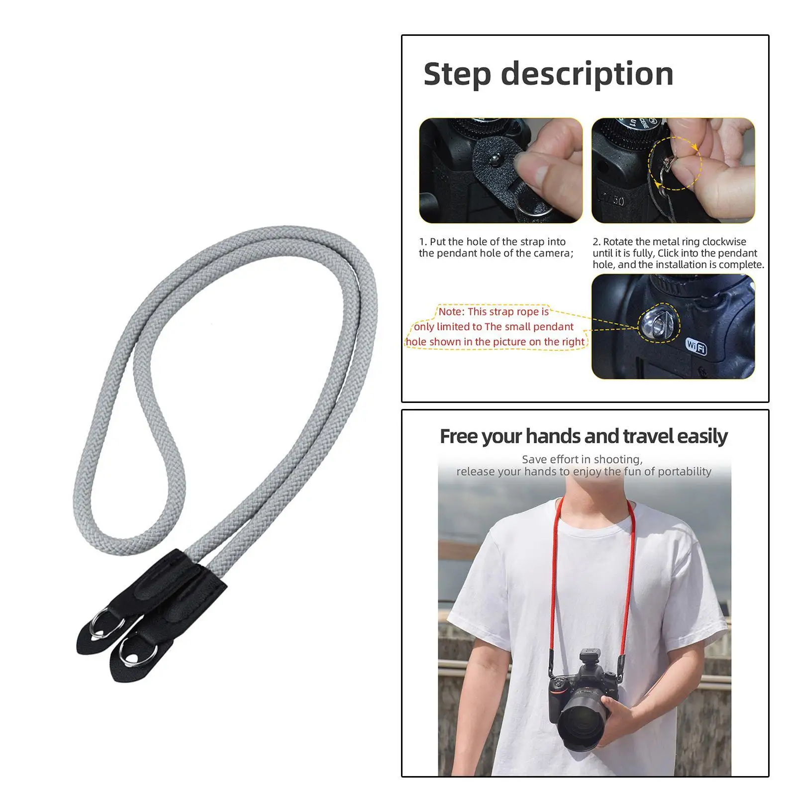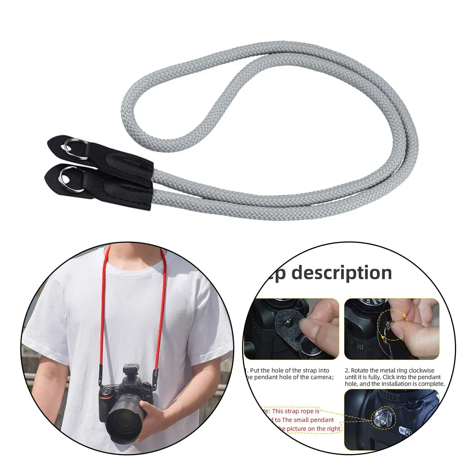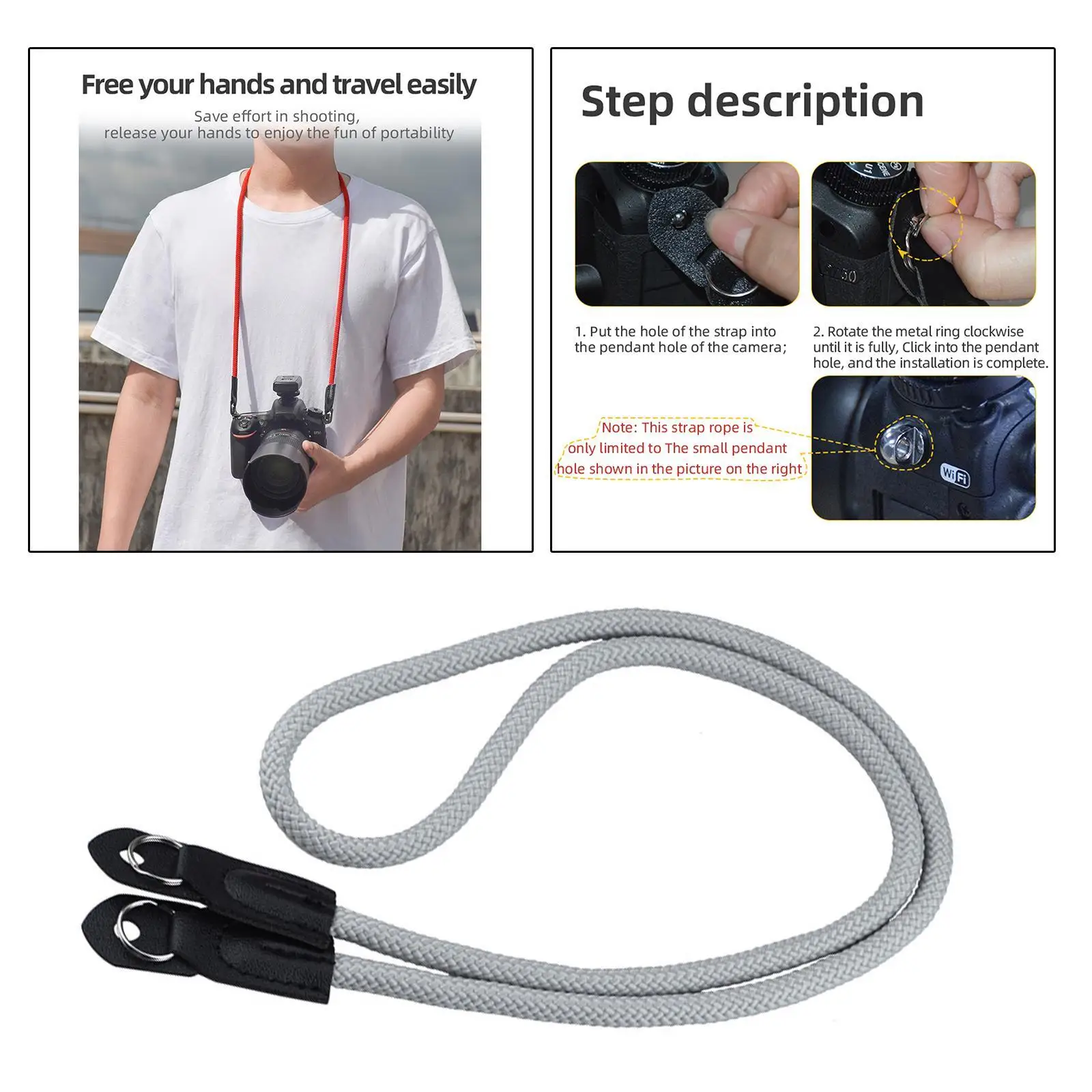 Descripción: Esta gran correa de la cámara es amde cuerda de escalada de nylon con un diámetro de 9mm y una longitud de 100cm, flexible y duradera. Colgado sobre el hombro, alrededor del cuello o simplemente la cámara alrededor de la muñeca. Fácil de instalar, la correa de transporte se puede utilizar para colgar cámaras retro o micro cámaras individuales. Esta correa de cámara es adecuada para mujeres y hombres. Simple, elegante y elegante, regalo perfecto para tus amigos que aman tomar fotos. Tabla de tallas: Longitud: aprox. 100cm/39,37 pulgadas Diámetro: aprox. 9mm/0,35 pulgadas El paquete incluye 1 pieza de correa para cámara