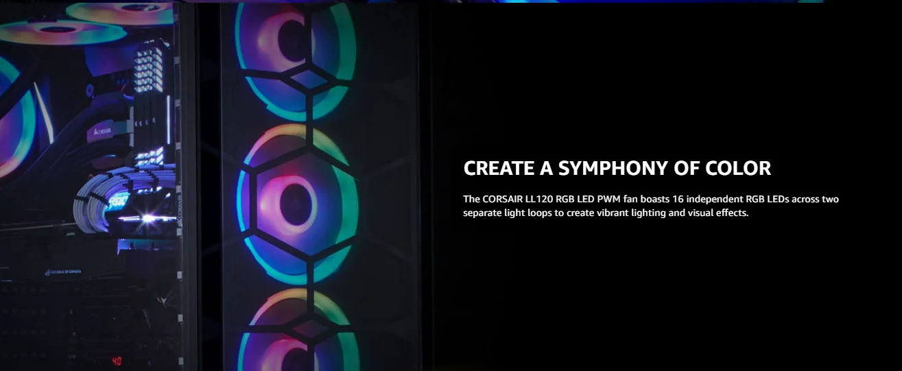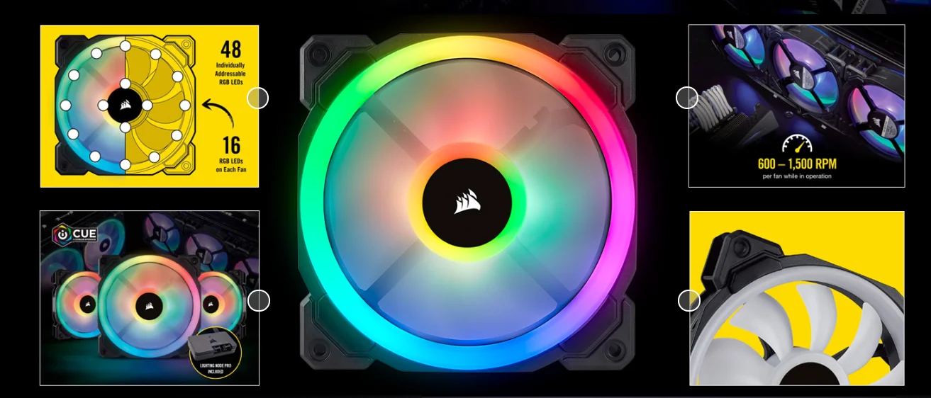 Complete su sistema refrigerado por RGB Corsair LL con un ventilador adicional con 16 LED RGB direccionables individualmente divididos entre dos bucles de luz separados Flujo de aire-63 CFM Nivel de ruido-36 0 decibelios