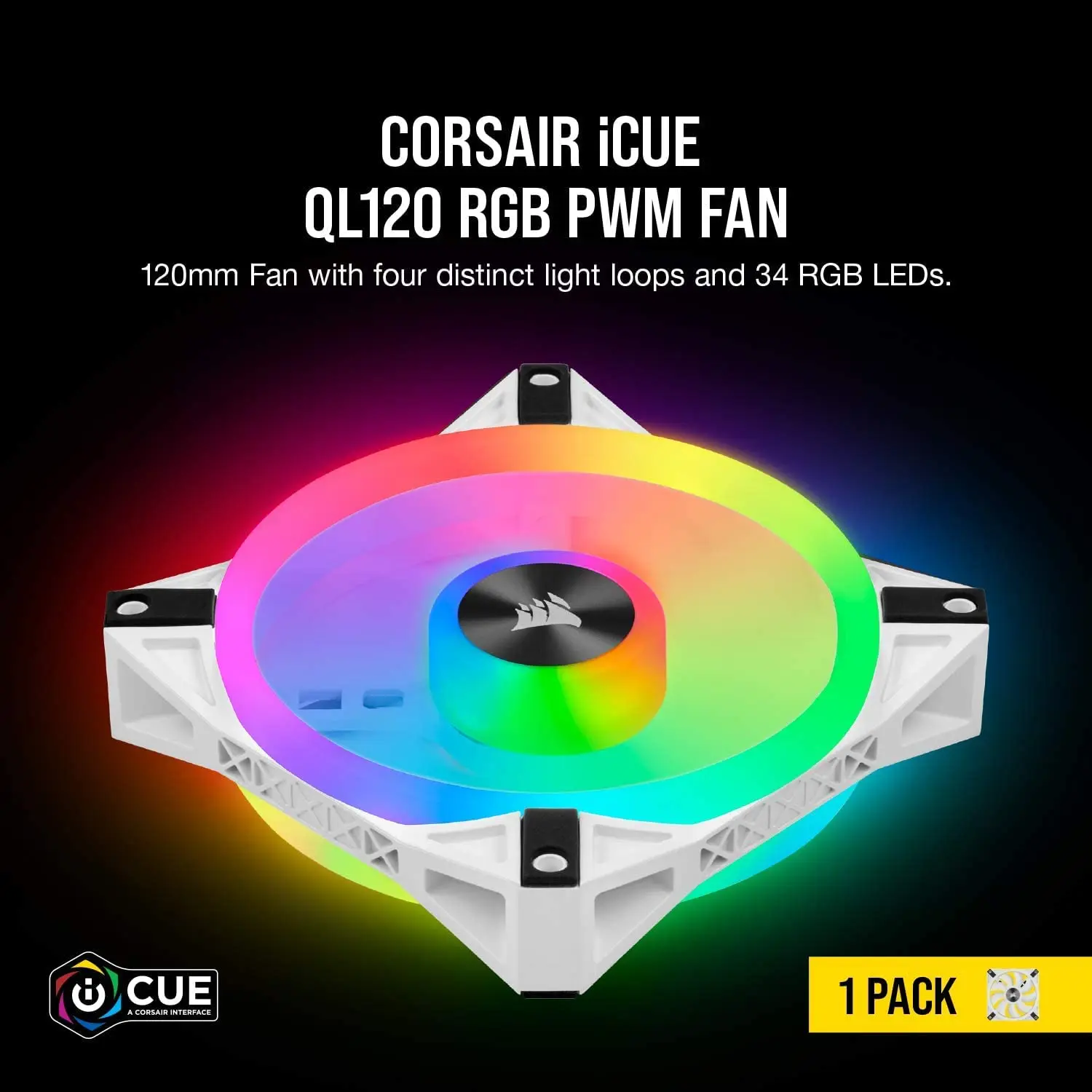 Serie Corsair QL, iCUE QL120 RGB, 120mm RGB LED PWM Ventilador único, Blanco y Negro
