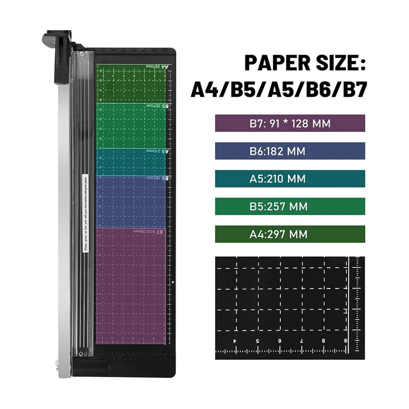 [Cuchillo pequeño, gran efecto] Nuestras hojas de acero mejoradas proporcionan cortes perfectamente ordenados.La rejilla alineada con precisión del cortador de papel resistente garantiza un corte rápido y preciso, adaptándose a una variedad de tamaños desde A3 hasta B7.¡Dile adiós a las luchas de corte!