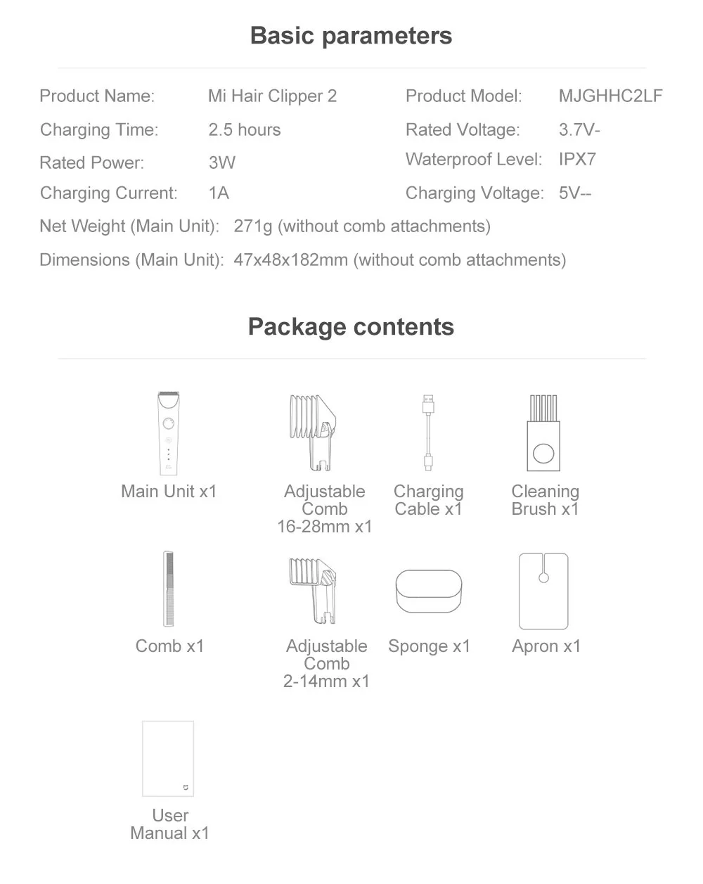 Mi Hair Clipper 2 Especificaciones:Parámetros básicos:, Nombre del producto: Mi Hair Clipper 2, Modelo del producto: MJGHHC2LF, Tiempo de carga: 2,5 horas, Voltaje nominal: 3,7 V-, Potencia nominal: 3W, Nivel impermeable: IPX7, corriente de carga: 1A, voltaje de carga: 5V --, peso neto (unidad principal): 271G (sin los accesorios del peine) 47x48x182mm (sin accesorios de peine)