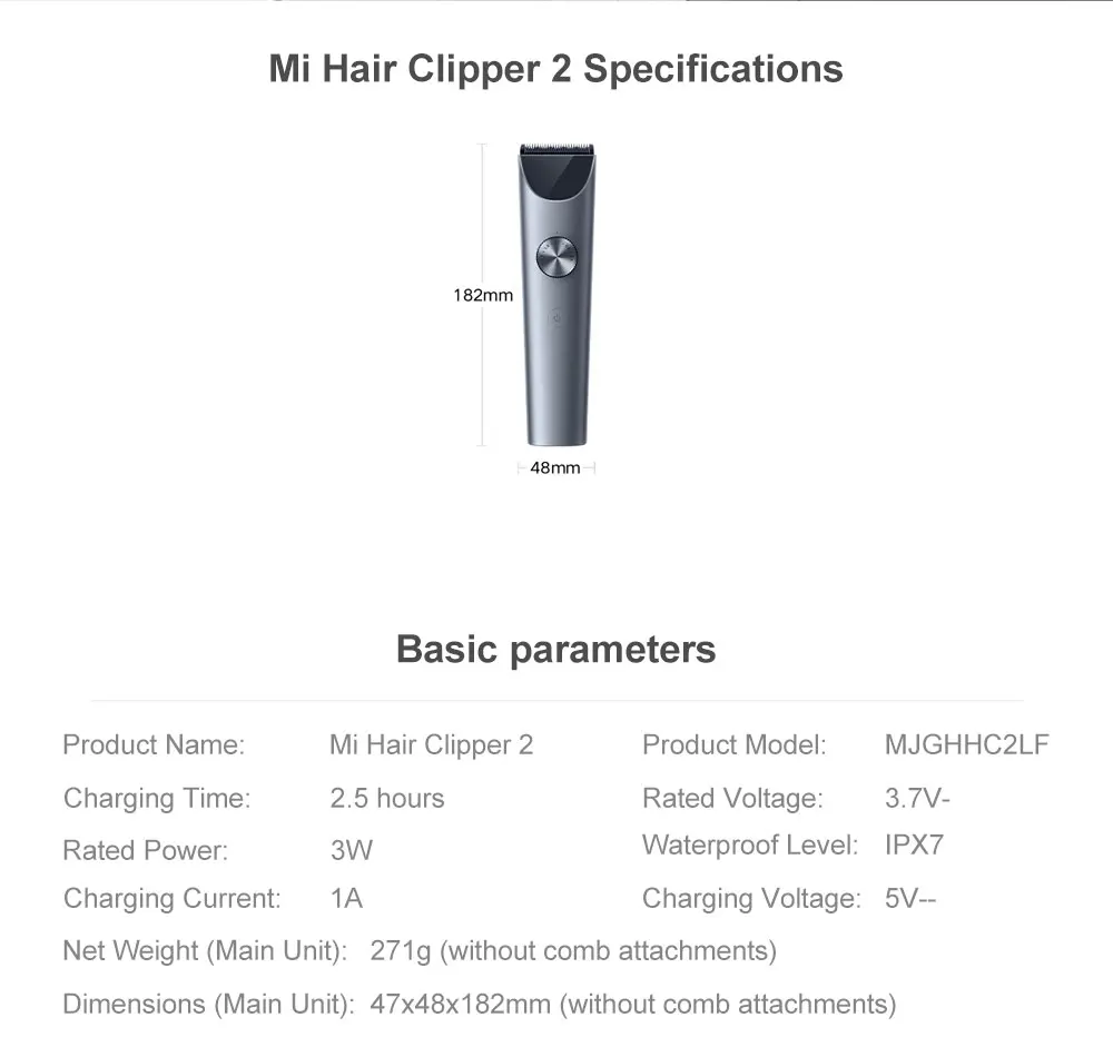 Mi Hair Clipper 2 Especificaciones:Parámetros básicos:, Nombre del producto: Mi Hair Clipper 2, Modelo del producto: MJGHHC2LF, Tiempo de carga: 2,5 horas, Voltaje nominal: 3,7 V-, Potencia nominal: 3W, Nivel impermeable: IPX7, corriente de carga: 1A, voltaje de carga: 5V --, peso neto (unidad principal): 271G (sin los accesorios del peine) 47x48x182mm (sin accesorios de peine)