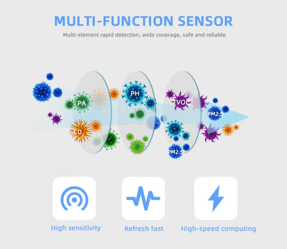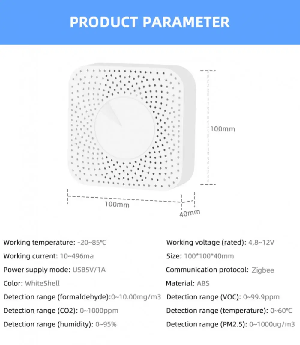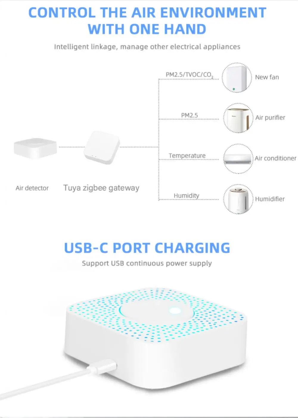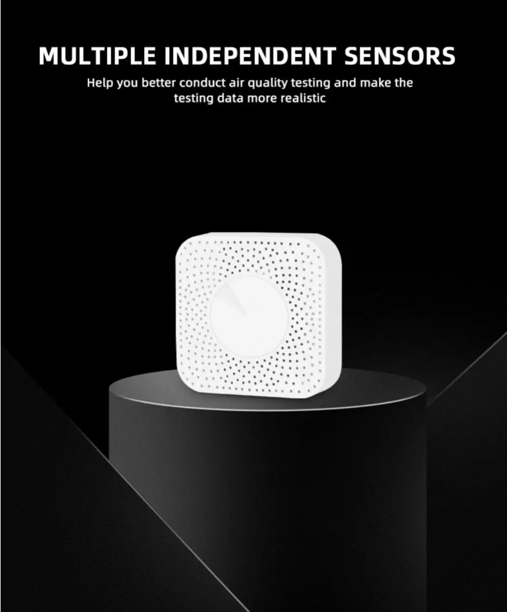 También puede detectar PM2.5, formaldehído, COV de gases venenosos, CO2, temperatura, humedad, etc. 6 tipos de parámetros ambientales, en parámetros ambientales exceden la oferta automáticamente cuando el aire acondicionado doméstico inteligente graffiti, nuevo ventilador, humidificador, purificador de aire en la optimización del entorno doméstico. Nota: No pongas Air housekeeper en el negro de lámpara si es aire de convección demasiado grande o en gas orgánico de alta concentración durante mucho tiempo, de lo contrario