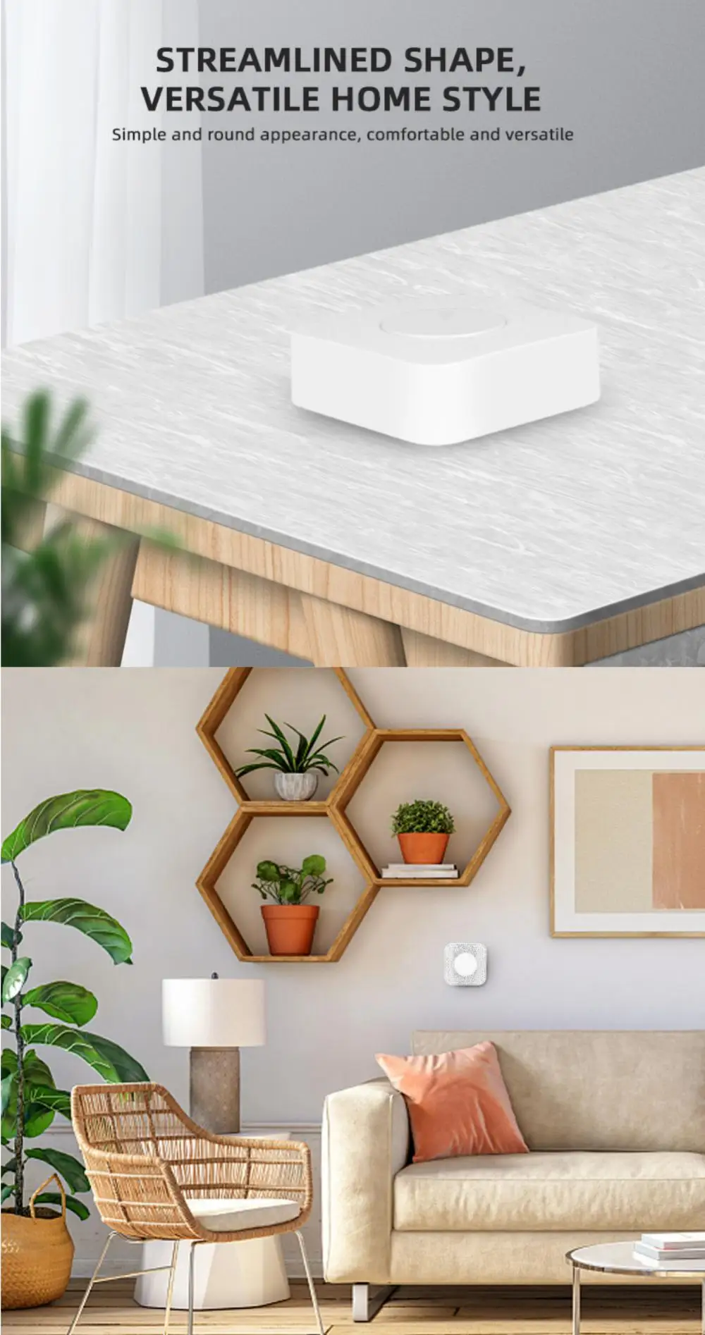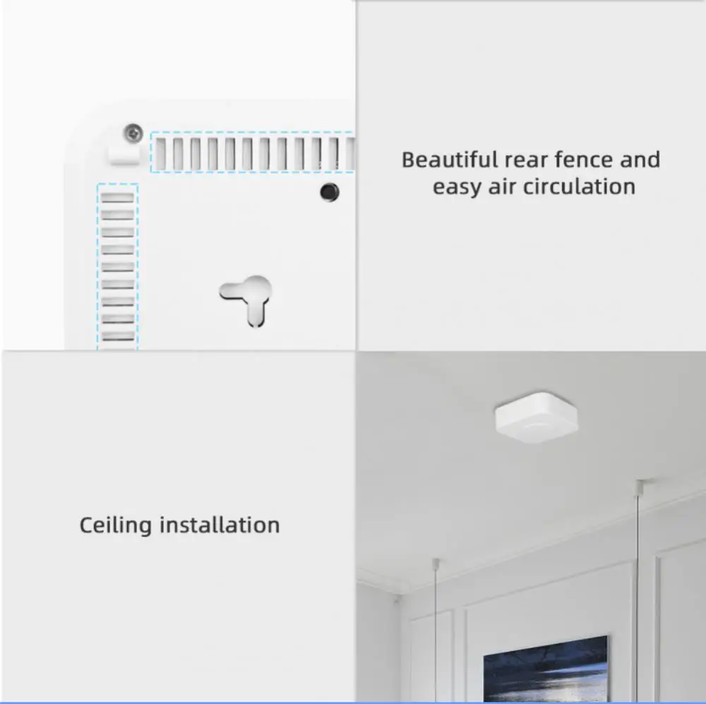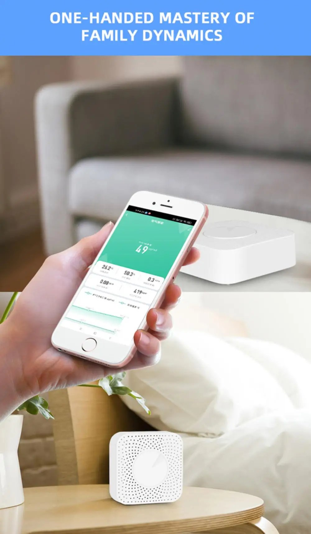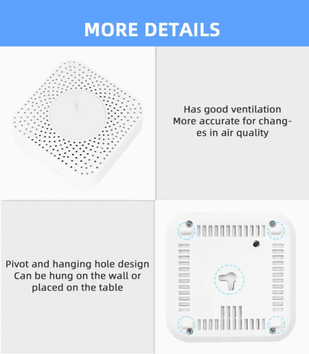 También puede detectar PM2.5, formaldehído, COV de gases venenosos, CO2, temperatura, humedad, etc. 6 tipos de parámetros ambientales, en parámetros ambientales exceden la oferta automáticamente cuando el aire acondicionado doméstico inteligente graffiti, nuevo ventilador, humidificador, purificador de aire en la optimización del entorno doméstico. Nota: No pongas Air housekeeper en el negro de lámpara si es aire de convección demasiado grande o en gas orgánico de alta concentración durante mucho tiempo, de lo contrario