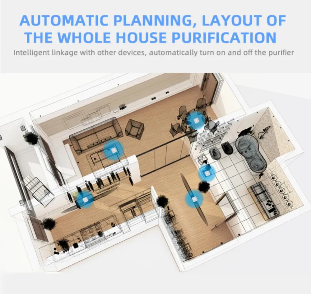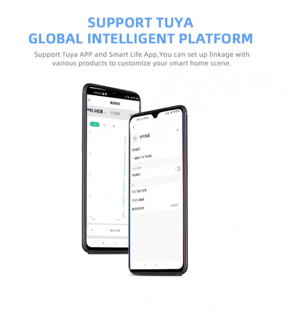Enlace de aire doméstico por la función de automatización de la aplicación Tuya de otros equipos en la habitación (como aire acondicionado, ventilador nuevo, purificador de aire, humidificador, etc.) Después de alcanzar un umbral predeterminado de control automático.