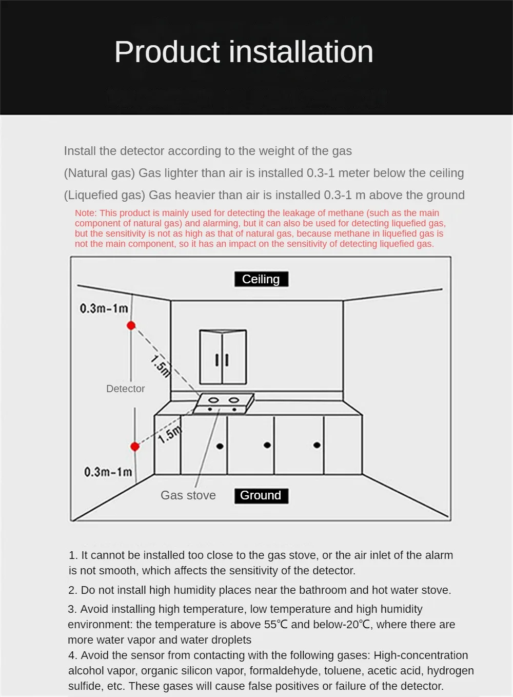 1 * alarma de fuga de gas + manual de instrucciones + piezas de instalación