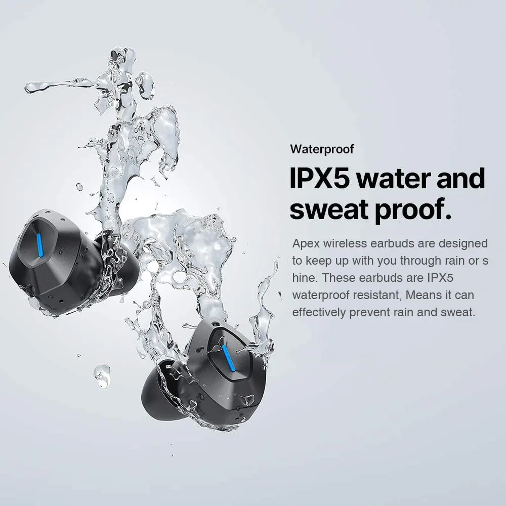 Los auriculares inalámbricos Apex están diseñados para seguirle el ritmo durante la lluvia o el sol. Estos auriculares son resistentes al agua IPX5, lo que significa que pueden prevenir eficazmente la lluvia y el sudor.