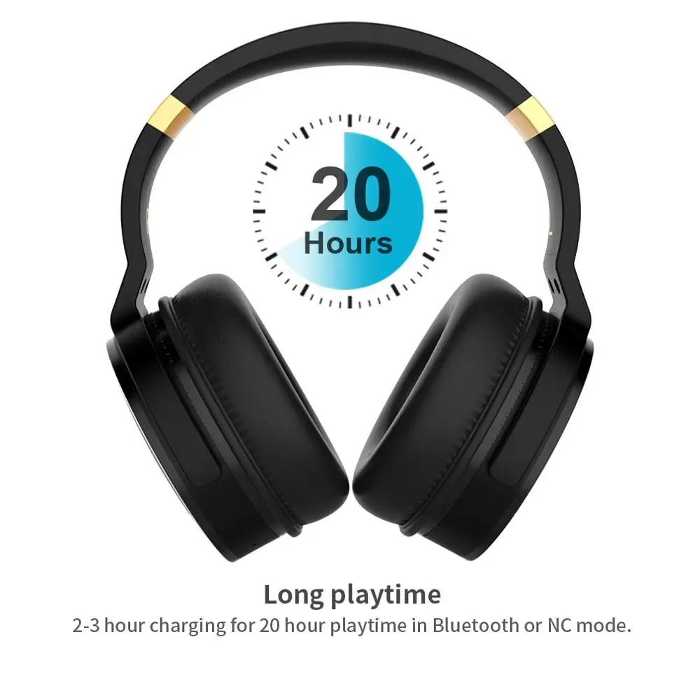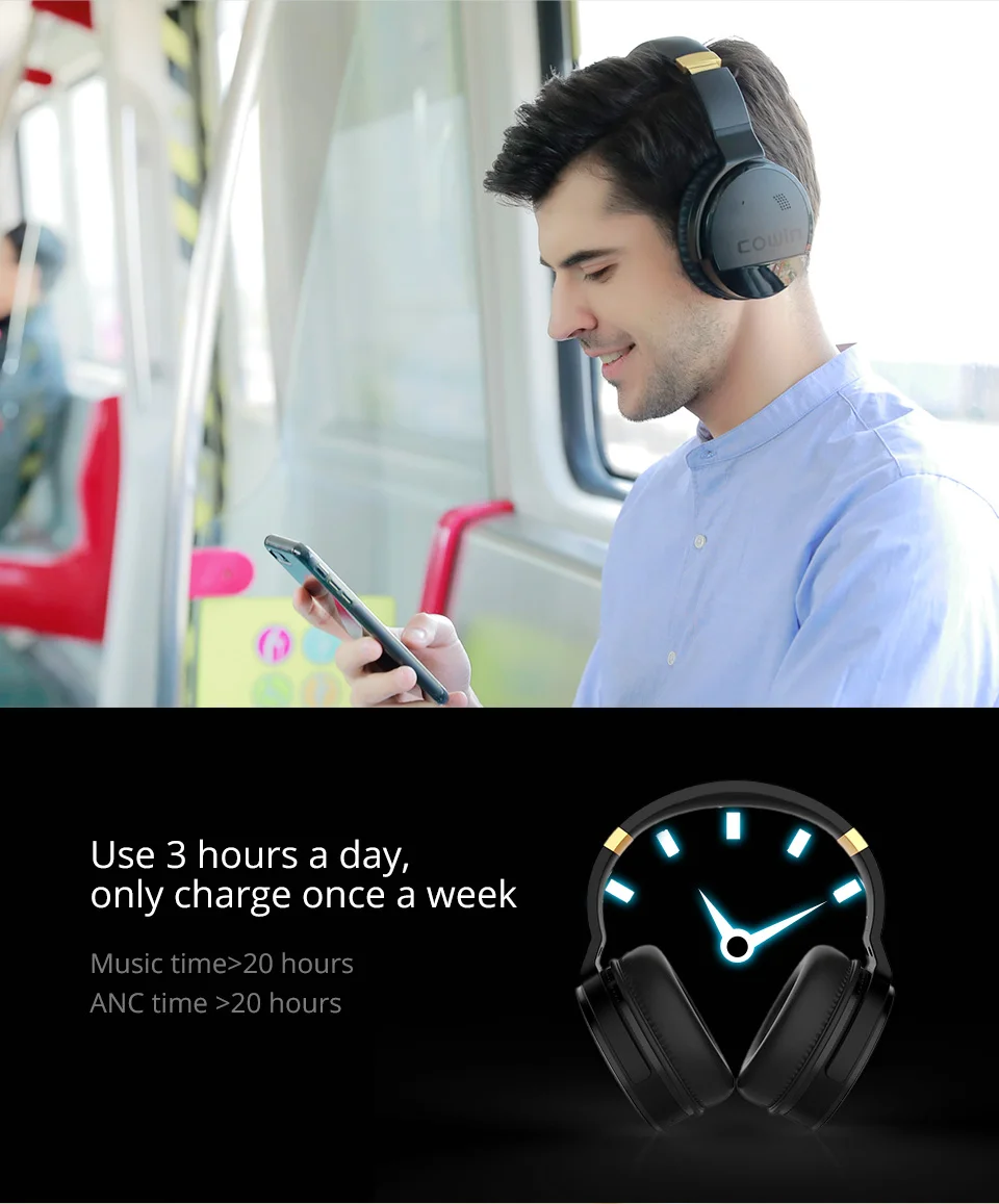Los auriculares COWIN E8 tienen una batería recargable de 545 mAh que, con ANC o Bluetooth encendido, tiene una duración de 20 horas, ¡proporcionándole casi un día completo de escucha!