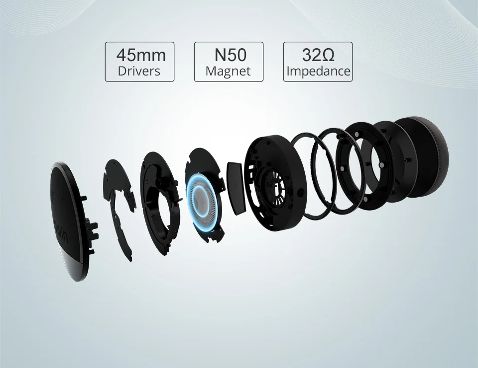COWIN E8 selecciona cuidadosamente cada accesorio, los controladores de gran apertura de 45 mm le brindan un sonido nítido y potente. El imán de alta resistencia N50 tiene una resolución más alta, el altavoz de 32 Ω proporciona más detalles.