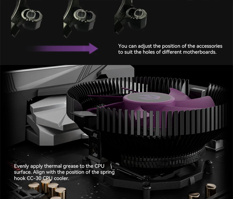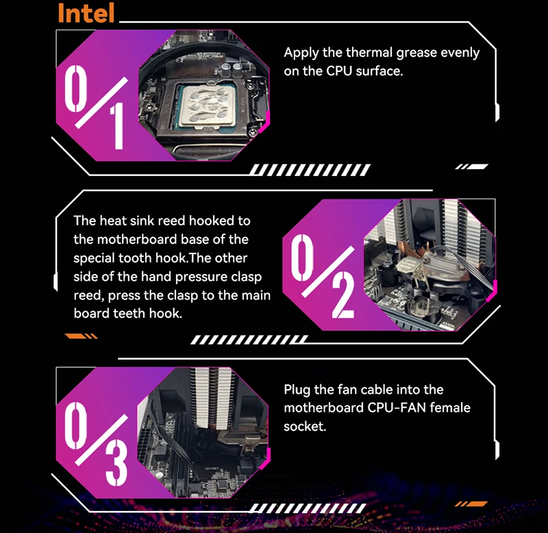 --Para AMD:AM4/AM2+/AM2/AM3+/AM3/FM1/FM2 (para AMD hay que mantener el soporte original en su placa base y simplemente abrochar el refrigerador estará bien)