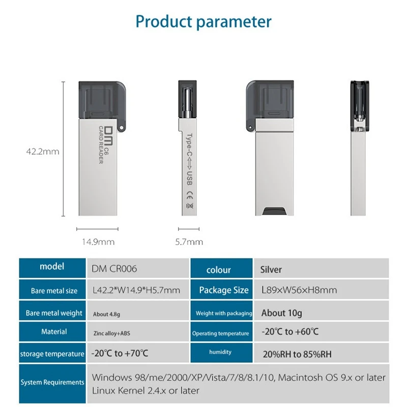 Instalación: Ranuras para tarjetas externas: Tipo único: Micro-SD Número de modelo: CR006 Interfaz: USB DM Tipo Lector de tarjetas de la red CR006 para Mac Huawei Xiaomi LG Sony Tablets Capacidad de soporte: Máximo 256G Color: plata Material: Aleación de zinc Tamaño: 4,2x1,5x0,6 cm Contenido del paquete: 1 * lector de tarjetas Solo el contenido del paquete anterior, Otros productos no están incluidos. Nota: La luz y las diferentes pantallas pueden hacer que el color del artículo en la imagen sea un poco diferente del real. El error de medición permitido es +/- 1-3cm.