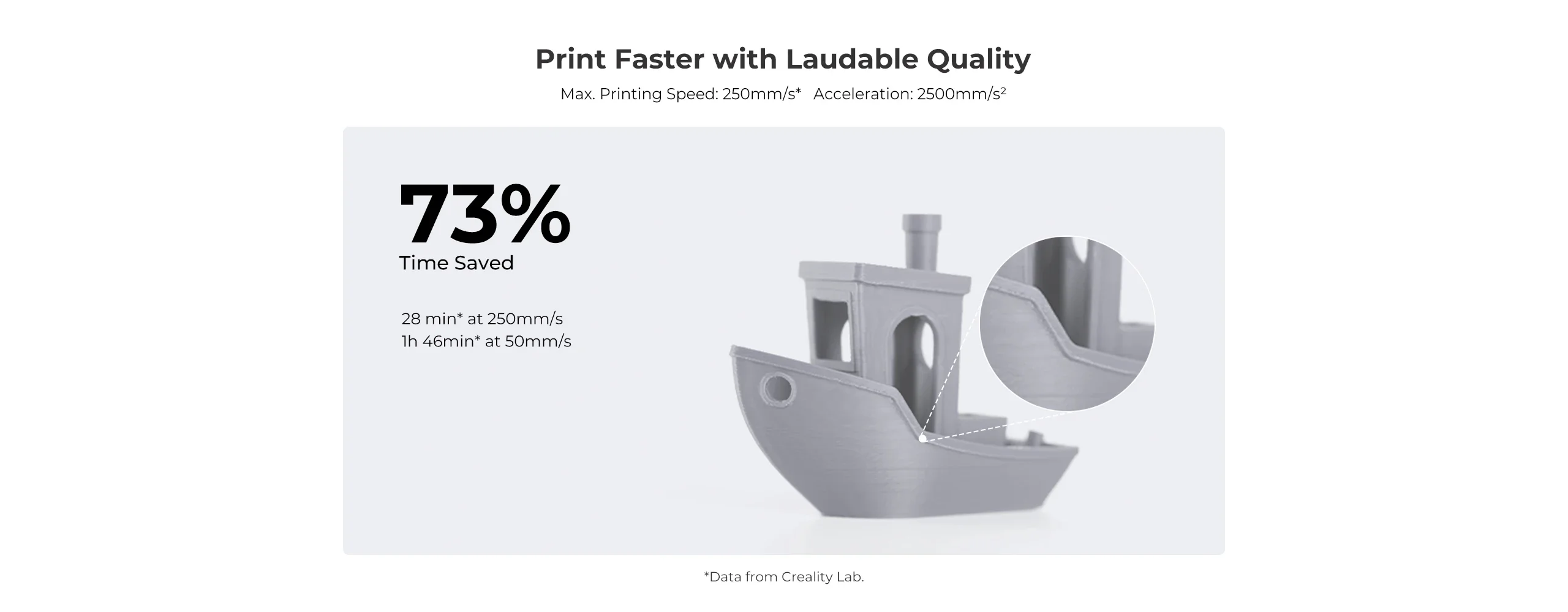La impresora 3D Creality Ender 3 V3 SE admite una velocidad máxima de impresión de 250 mm/s, aceleración de 2500mm/s². La velocidad se ha mejorado mucho mientras se mantiene la calidad de impresión, ahorrando el 73% del tiempo en comparación con otras impresoras.