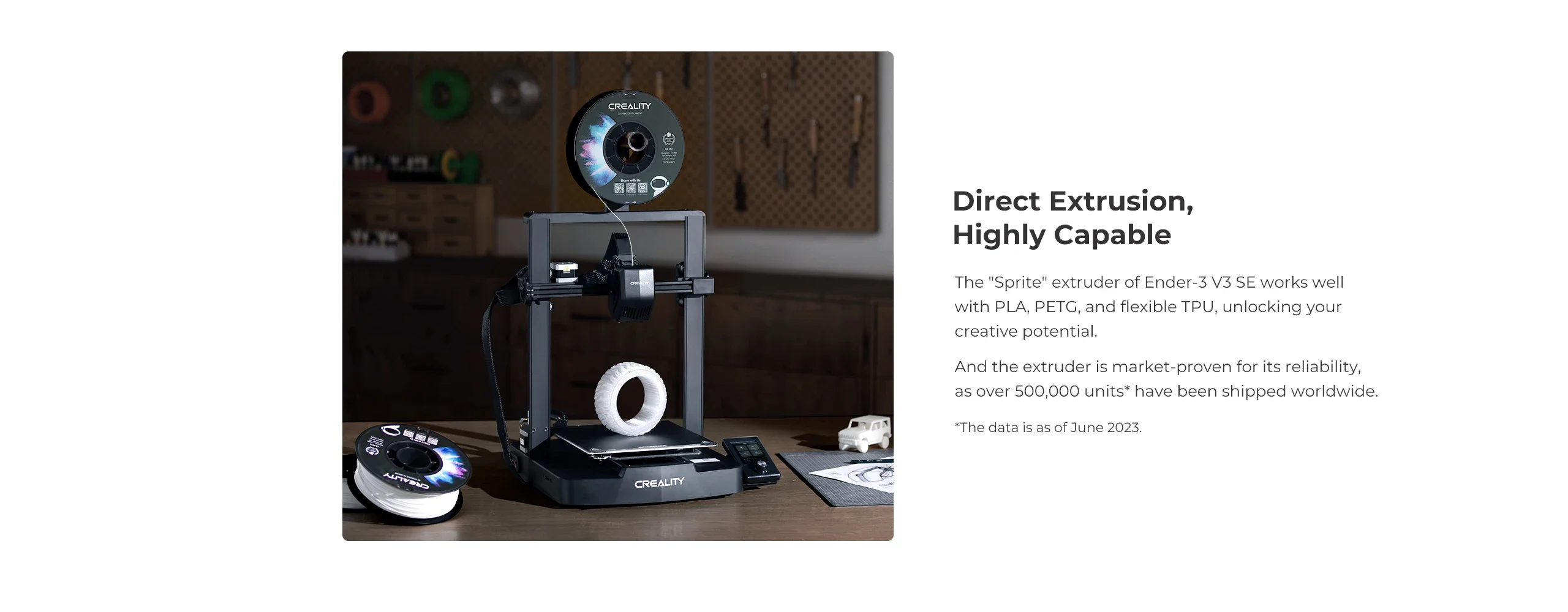 Ender 3 V3 SE es la actualización de Ender 3, Ender 3 V2, Ender 3 PRO, Ender 3 neo, Ender 3 V2 neo, Ender 3 S1, Ender 3 S1 Pro, etc. impresora 3D, viene con el nuevo extrusor de doble engranaje de metal completo "Sprite" actualizado, Extrusora de fuerza de empuje más potente y ligera, la extrusora realiza una alimentación y descarga suaves de los restos sin resbalar. Funciona extremadamente bien en impresiones como PLA, TPU, PETG, etc. Y el extrusor está probado en el mercado por su fiabilidad, ya que se han enviado más de 500.000 unidades a todo el mundo.