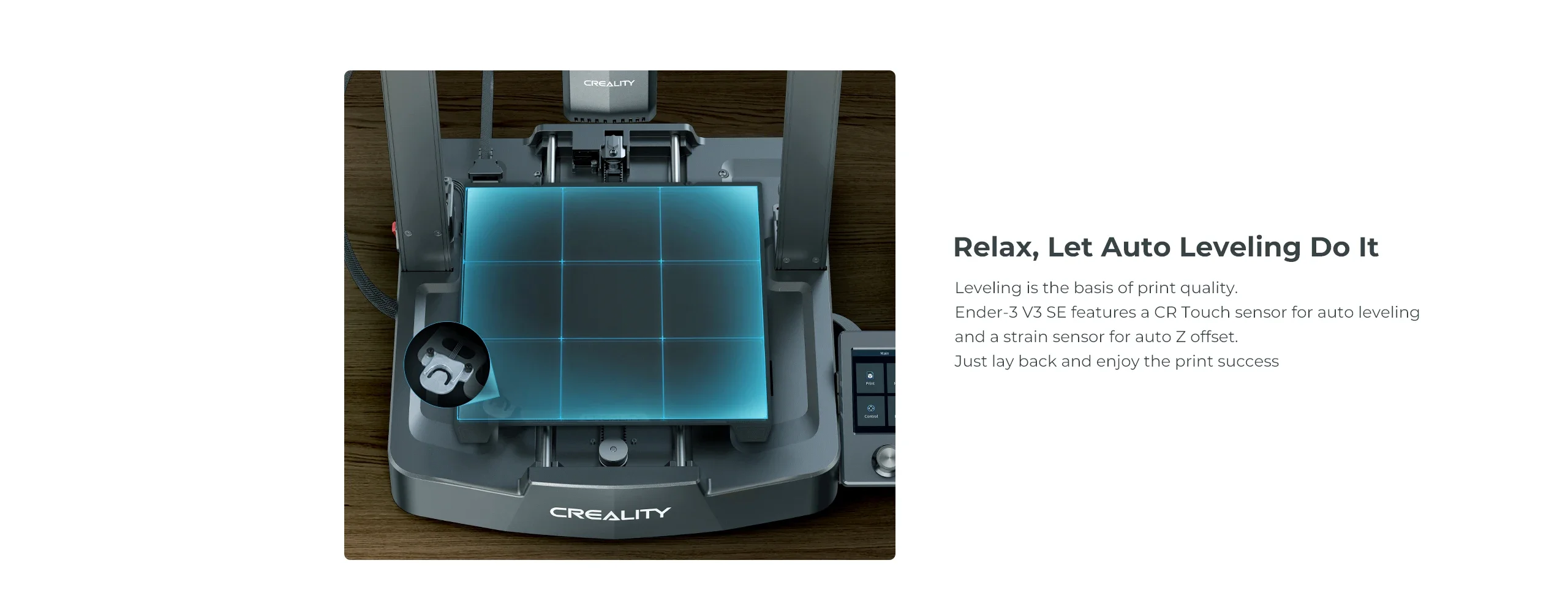 Ender-3 impresora 3D V3 SE cuenta con un sensor CR Touch para nivelación automática y un sensor de tensión para desplazamiento Z automático. Simplemente recuéstese y disfrute del éxito de la impresión, no hay necesidad de participar manualmente durante todo el proceso, lo que facilita mucho la nivelación.