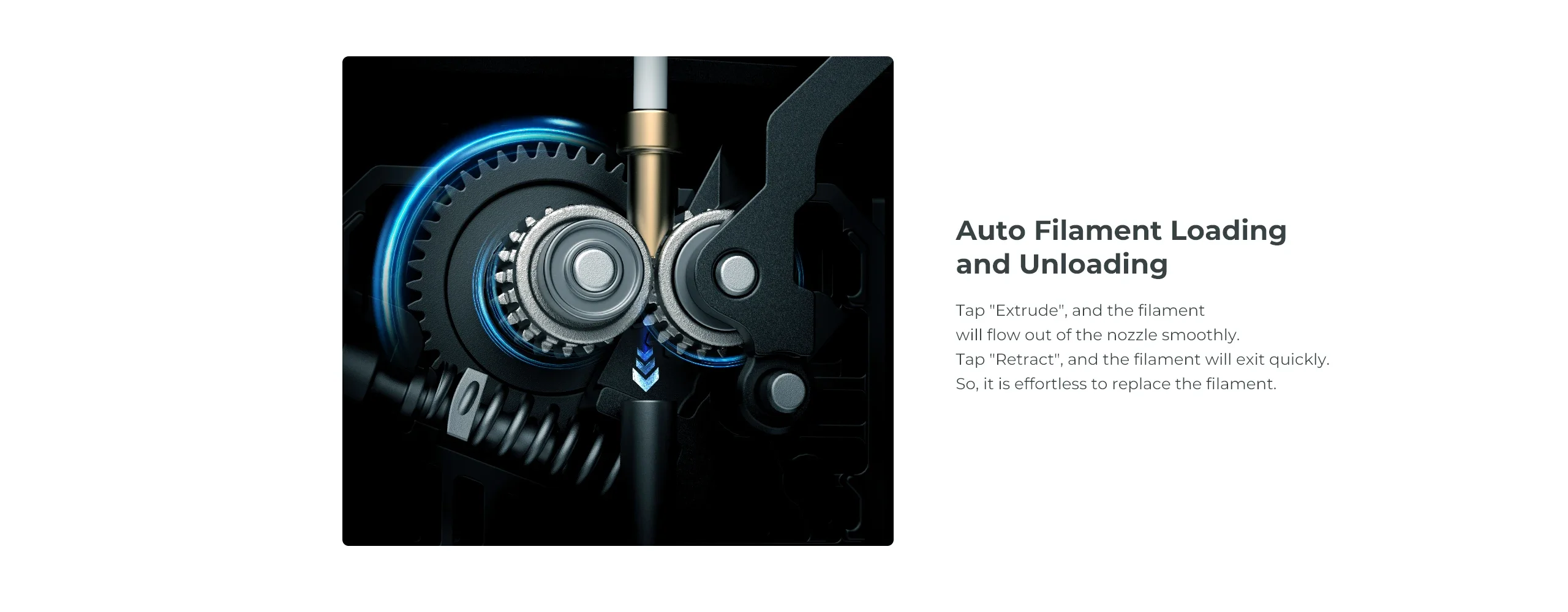 Ender 3 V3 SE admite la función de carga y descarga automática de filamentos. Toca "Extruir" y el filamento saldrá de la boquilla suavemente. Toca "Retraer" y el filamento saldrá rápidamente. Por lo tanto, es fácil reemplazar el filamento.