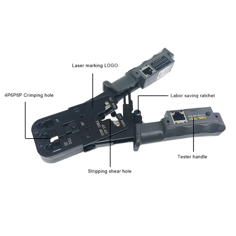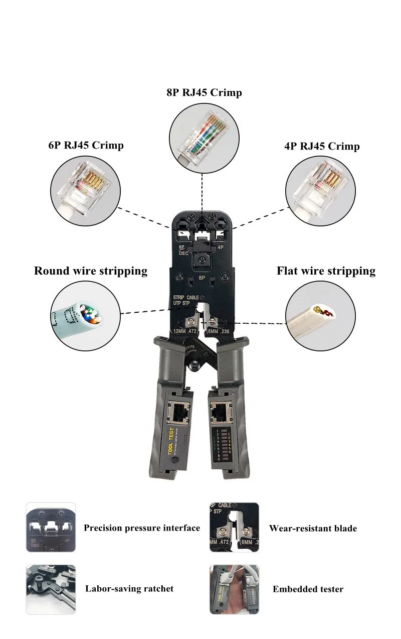 Compatible con todos los conectores RJ45 y RJ12/11, así como con todos los enchufes modulares estándar, excepto AMP. Fácil de engarzar con la fuerza de la mano. Engarce conectores RJ45 de 6 y 8 pines, más conectores RJ45 y RJ12/11. La parte frontal termina los contactos; La parte trasera riza el suelo externo. Termina a alturas de engarce especificadas en la industria. El Mango antideslizante y las ranuras para los dedos garantizan un agarre seguro.