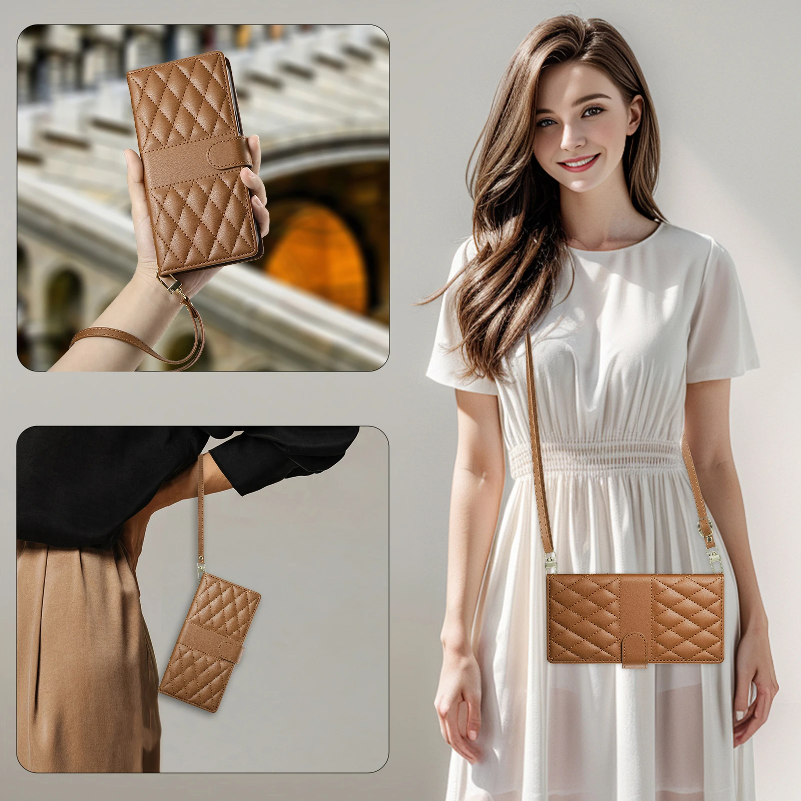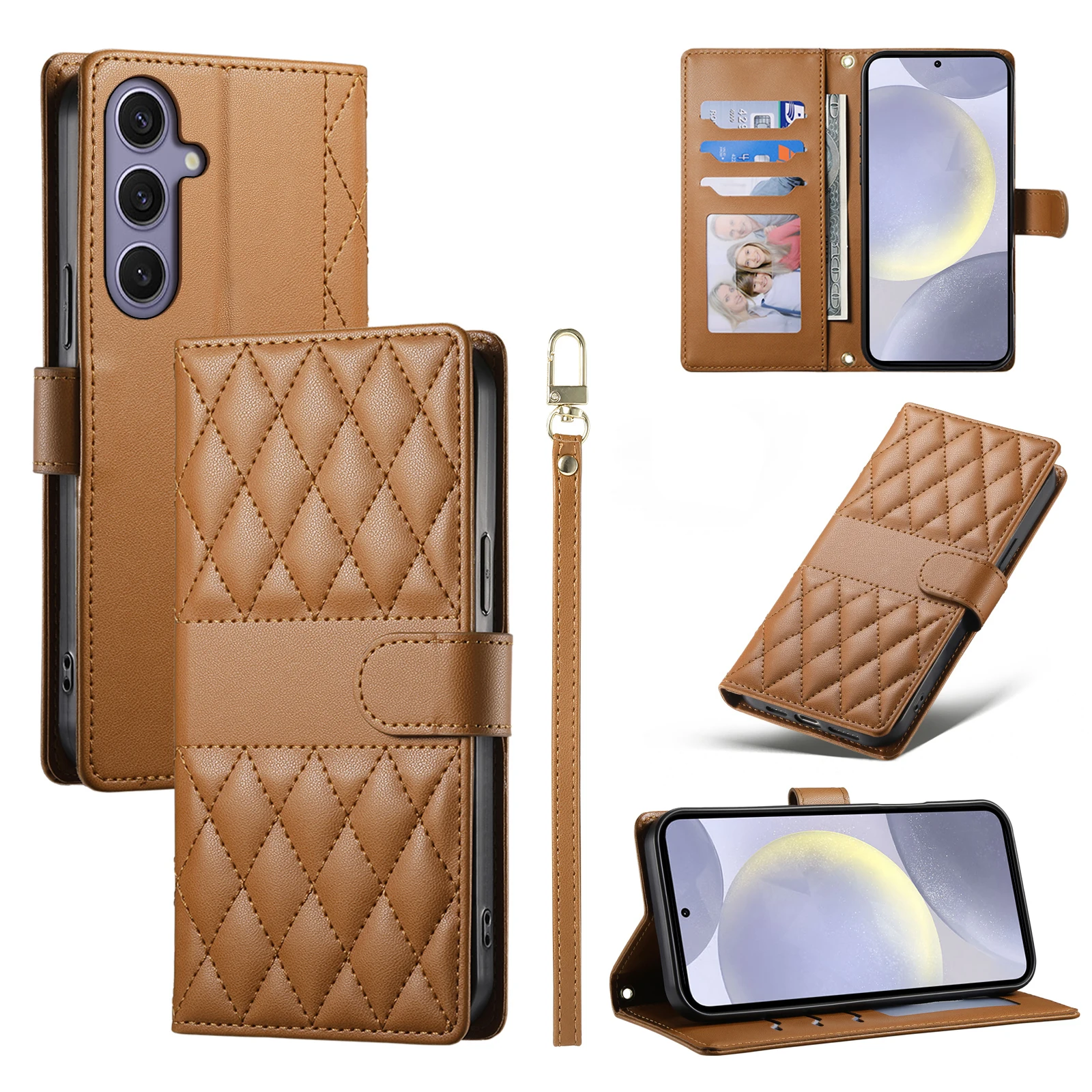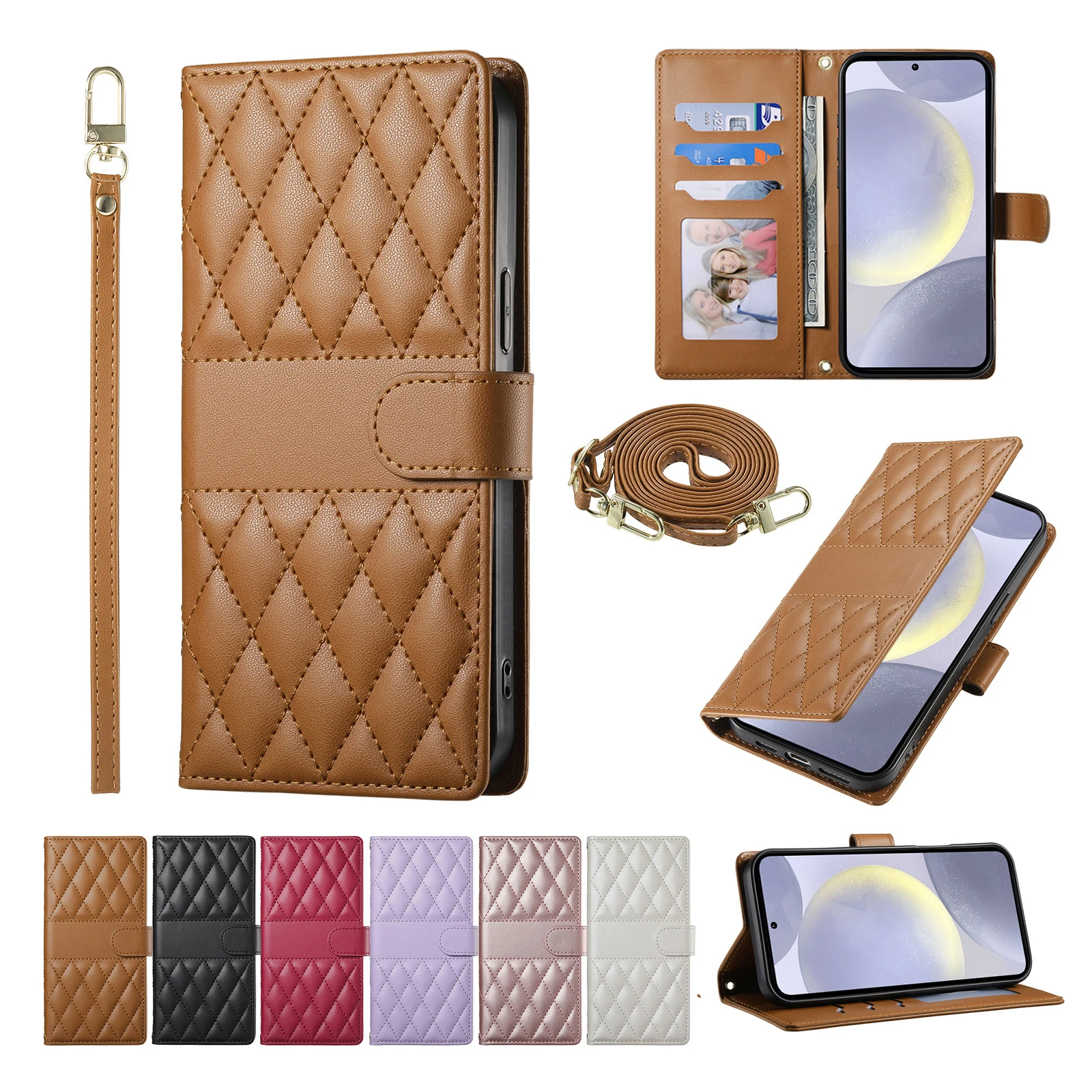 Comprar Crossbody Card Solt Wallet Leather Case For Samsung Galaxy S25 Ultra A16 A36 A56 A55 A15 S24 Plus S23 FE Grid Lanyard Flip Cover