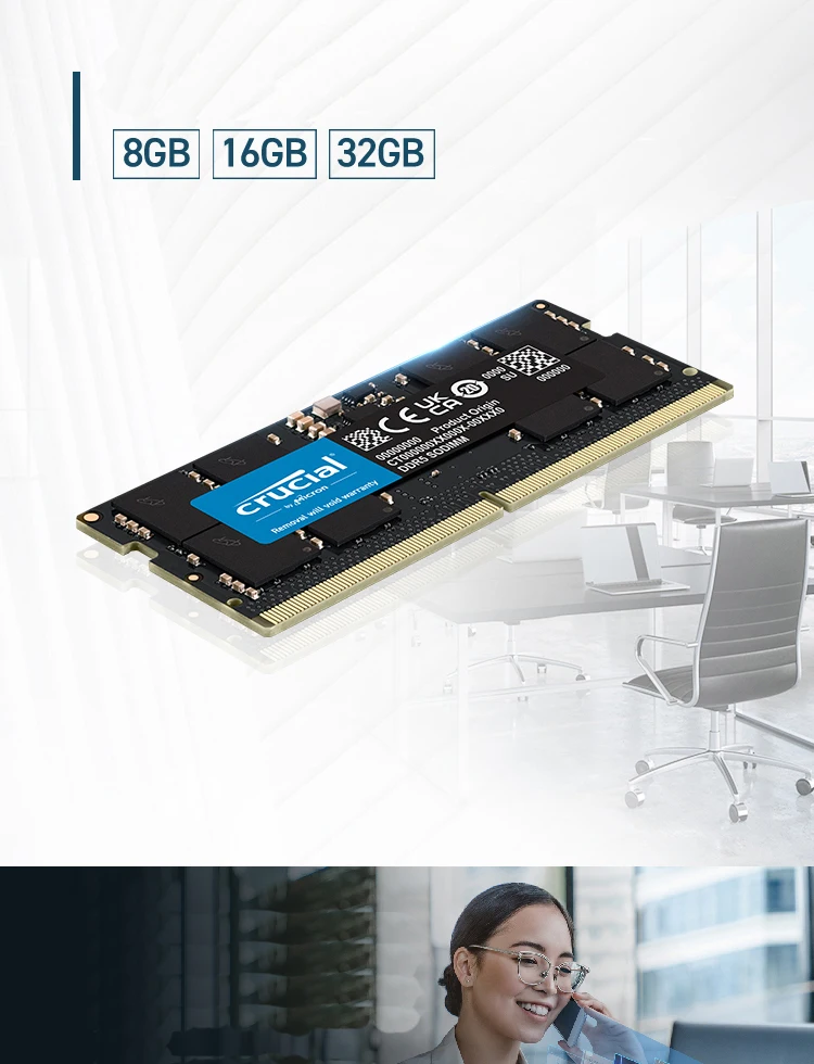 La memoria Crucial DDR5 para portátil tiene la alta velocidad necesaria para la próxima generación de CPU multinúcleo, pero no solo es más rápida que la DDR4, es mejor. Multitarea sin problemas, carga, analiza, edita y renderiza más rápido, todo con mayor velocidad de fotogramas, significativamente menos retardo y eficiencia energética optimizada en comparación con la generación anterior². Con la memoria para portátil Crucial DDR5, su portátil puede aprovechar velocidades increíbles que antes solo eran posibles con una memoria de rendimiento extremo.