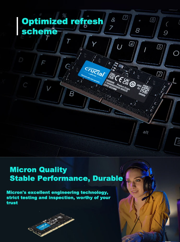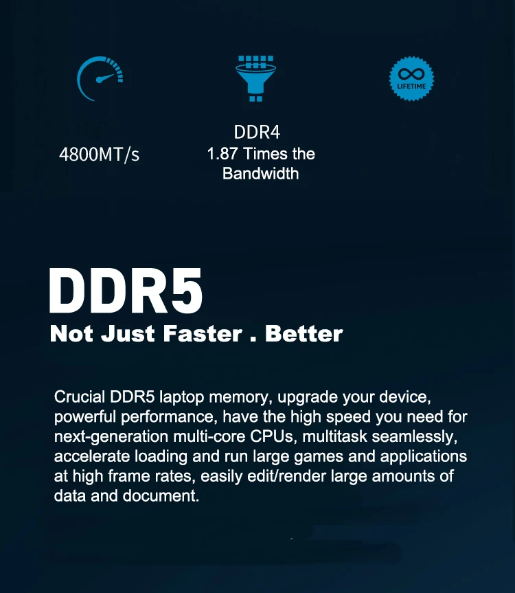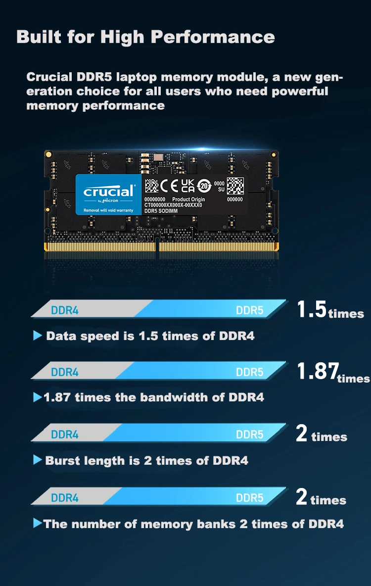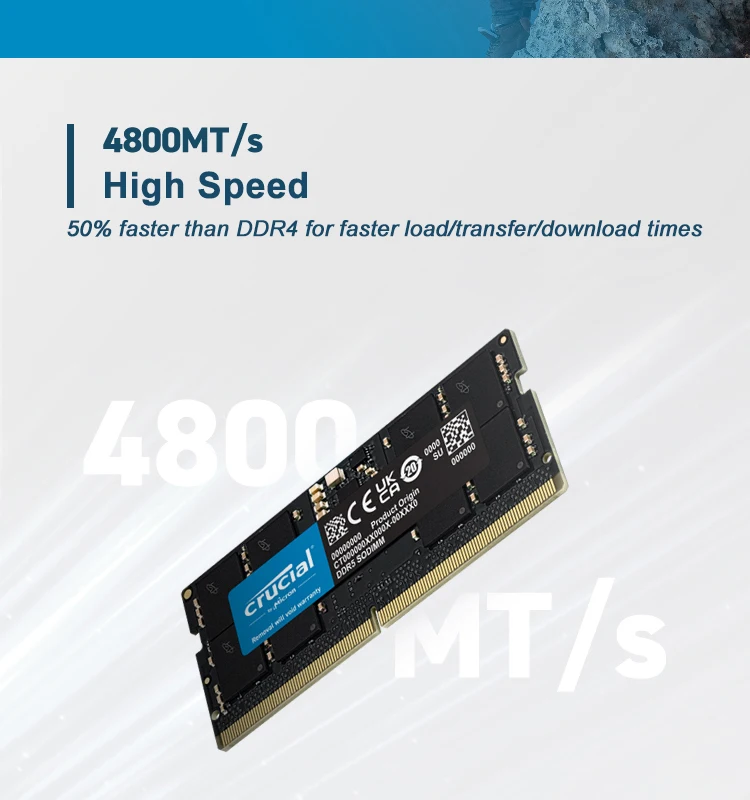 La memoria Crucial para portátil DDR5 puede permitir a su computadora transferir datos 50% más rápido que el DDR4 en el lanzamiento, lo que resulta en tiempos de carga más cortos, transferencias de archivos, descargas, tiempo de retraso y tasas de actualización mejoradas. Debido a la mayor eficiencia del bus, la tecnología DDR5 no solo es más rápida que la generación anterior, sino que es mejor.