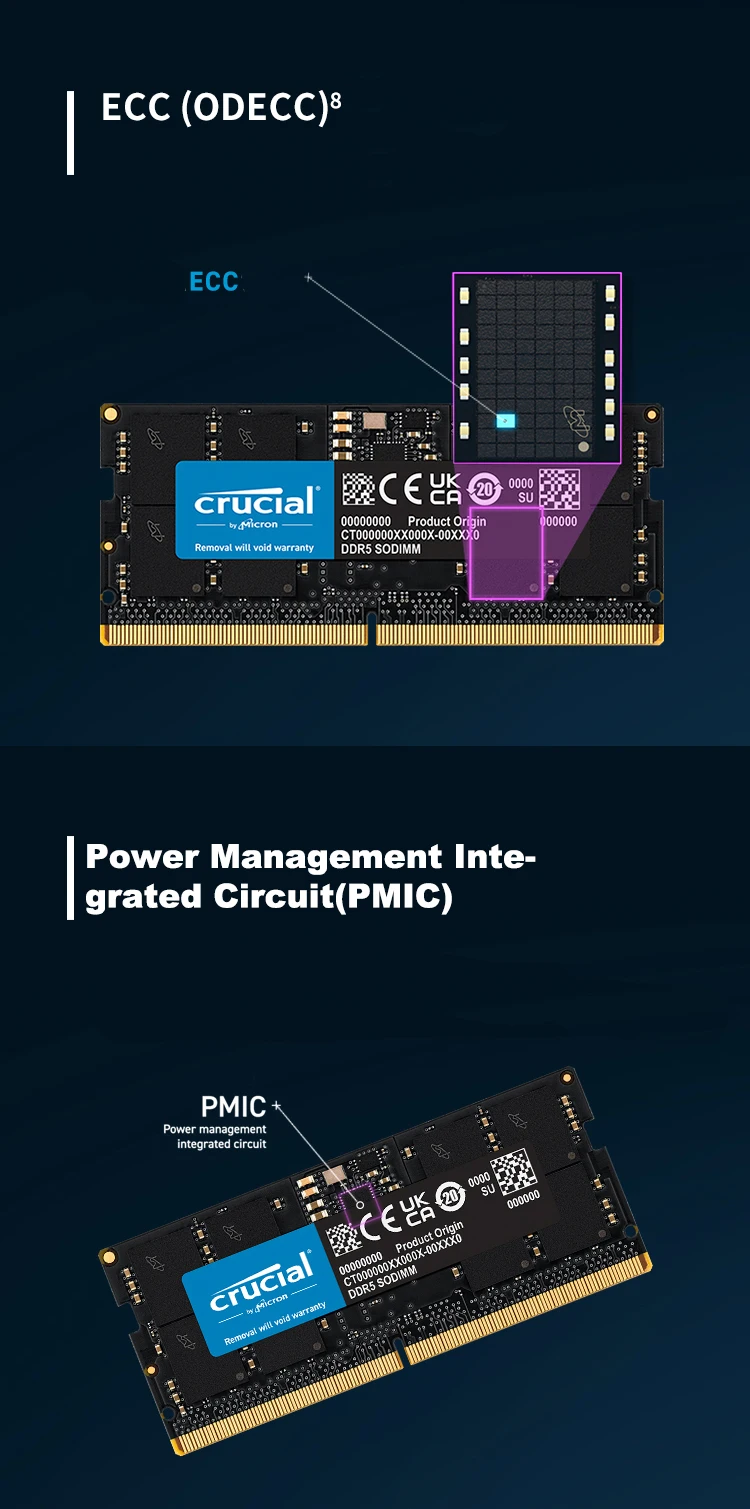 Para mejorar la eficiencia y la estabilidad, Crucial DDR5 introduce una regulación de voltaje en el módulo con un circuito integrado de administración de energía (PMIC), que estaba en la placa base con tecnologías de memoria más antiguas. Esto da como resultado una señalización mejorada y una Regulación de potencia más limpia para los módulos (SODIMM) ⁷. Además, el voltaje de funcionamiento en el módulo DDR5 es de solo 1,1 V en comparación con el 1,2 V de DDR4.
