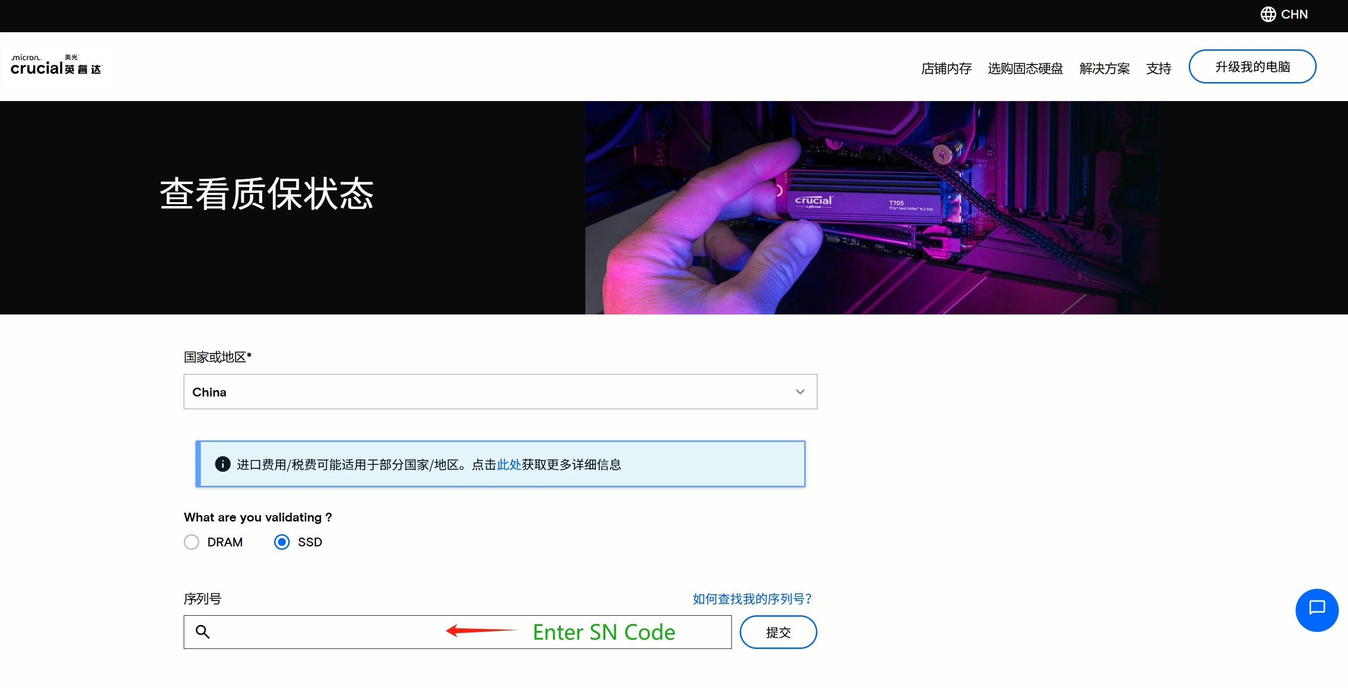 2.Vaya al siguiente sitio web:https://www.crucial.cn/warranty-home, Ingrese el código del producto (Código SN) y podrá verificar la información del producto.(El origen debe ser seleccionado como China, otras regiones no admiten la verificación)