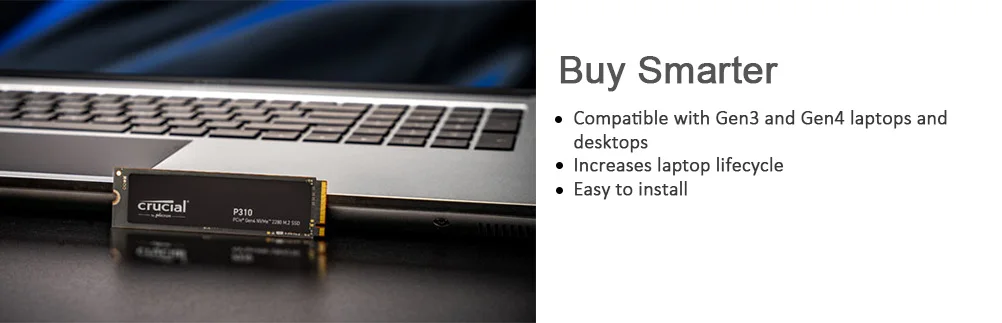 2.La comparación de velocidades se encuentra entre Crucial P310 con velocidades máximas publicadas de 7.000 MB/s y las velocidades Gen3 publicadas más rápidas para SSD NVMe, a 3.500 MB/s.Tu velocidad puede variar.