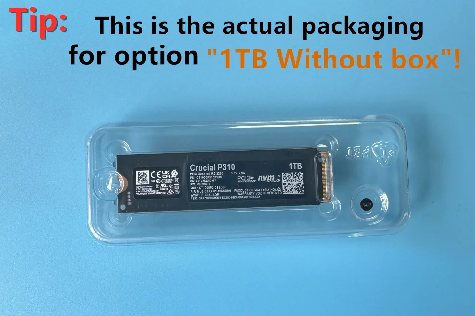 Consejos: Proporcionamos embalaje OEM para este producto de sitio web.Todos los SSD son nuevos y genuinos, y tienen la misma garantía que el SSD de caja original. El embalaje que elegimos es el embalaje OEM, que combina con cajas de plástico transparentes y cajas de papel kraft, para proteger mejor los productos.Al mismo tiempo, todos los productos admiten la verificación de autenticidad en el sitio web oficial de CRUCIAL.(Las siguientes imágenes son imágenes reales del embalaje)