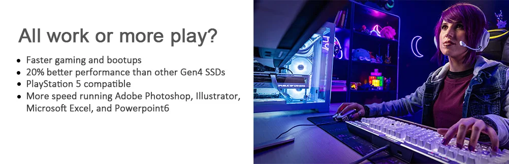 MEJOR PRODUCTIVIDAD: Rendimiento hasta un 20% más rápido en tareas del mundo real6 en comparación con otros SSD Gen4 al iniciar Windows, iniciar aplicaciones como Adobe Photoshop e Illustrator, y trabajar en aplicaciones como Microsoft Excel y PowerPoint