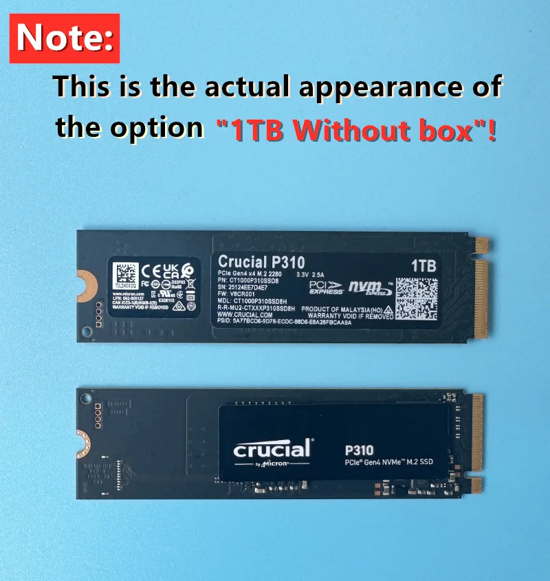 El producto de 500 GB/1 TB/2 TB que se muestra en la página web tiene aproximadamente la capacidad de la unidad de estado sólido CRUCIAL P3 PLUS.La velocidad máxima de lectura del SSD P3 PLUS es de 5000 MB/s.P310 de 1 TB es una unidad de estado sólido mejorada con una velocidad máxima de escritura de 7100 MB/s.¡Confirma el producto antes de comprar!!