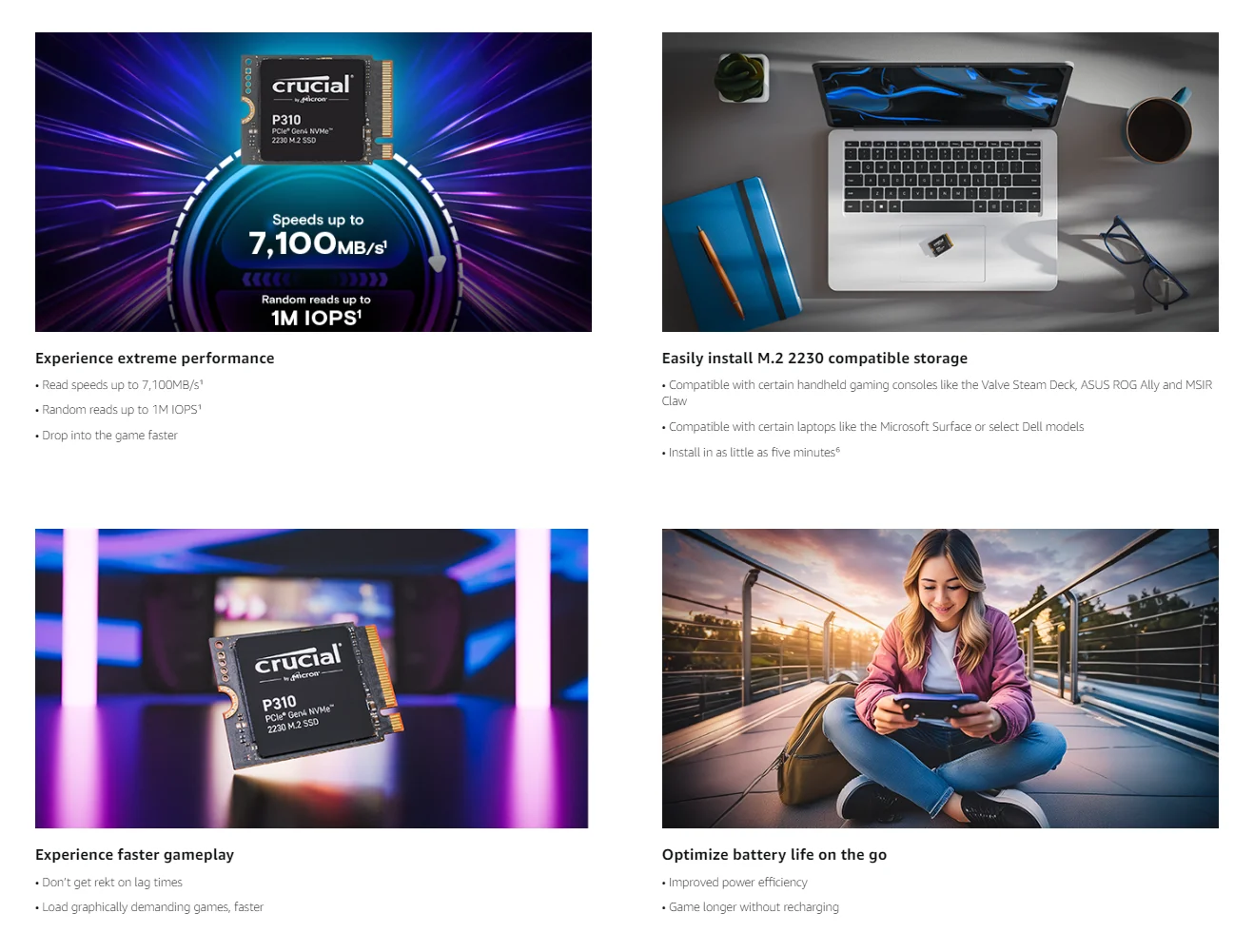 Comprar Crucial P310 1TB 2TB M.2 2230 NVMe PCIe Gen4 SSD interno compatible con Steam Deck ASUS ROG Ally MSI Claw y Microsoft Surface