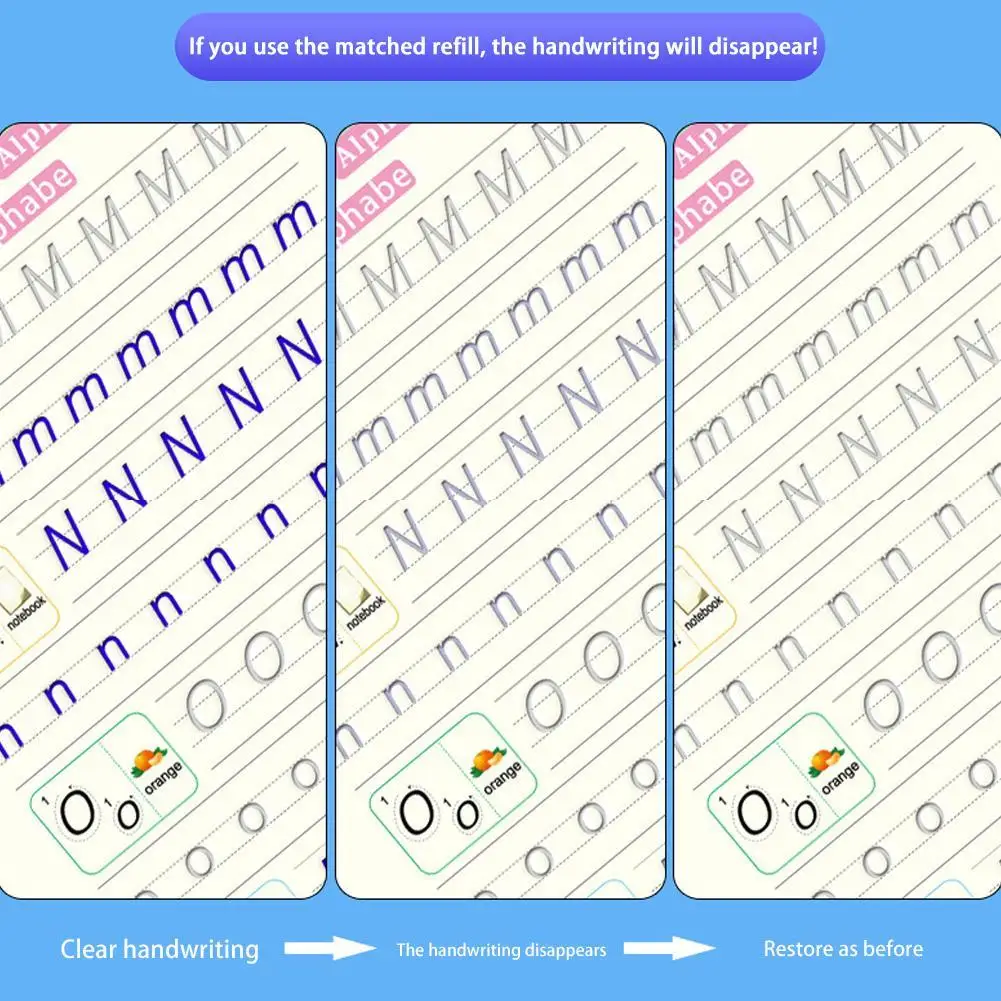 Reutilizable: Libro de letras mágicas para niños La escritura desaparecerá dentro de los 10 minutos posteriores a la escritura, por lo que el libro de escritura se puede utilizar una y otra vez.Libro de práctica de escritura a mano con lápiz de recambio El cursivo inglés se puede reutilizar.Libro mágico ranurado