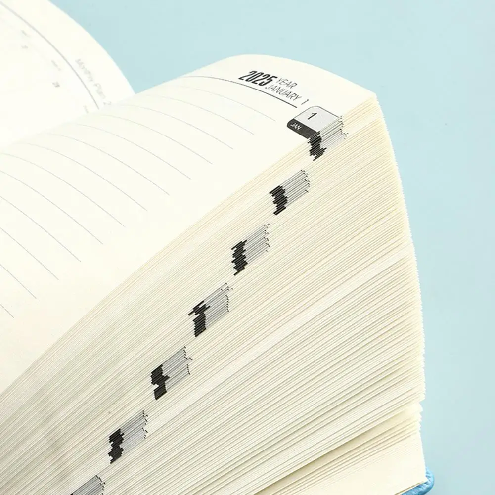 Planificador diario 2025 con 12 meses de páginas detalladas mensuales y semanales.