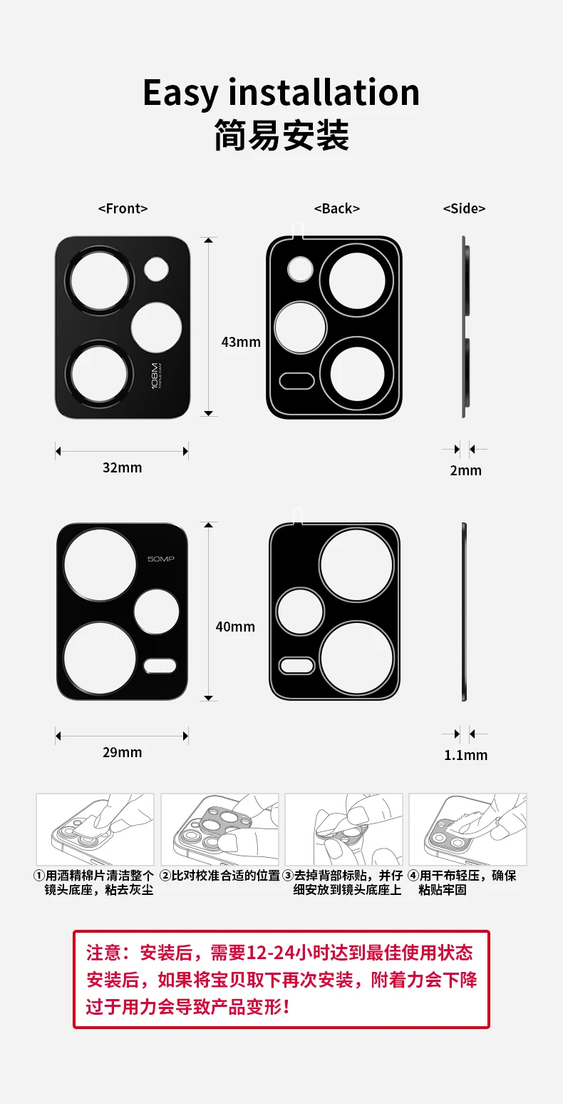 Fácil de instalar: Simplemente retire la película de la lente de aleación de aluminio y ajuste el ángulo y luego suelte la película de la lente de aleación de aluminio que se pegará a la lente automáticamente.