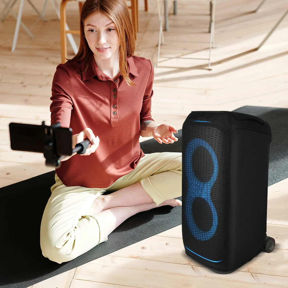 3.Diseño fácil de usar:Con una solapa antipolvo enrollable en la parte superior, la cubierta del altavoz permite un fácil acceso a los controles del altavoz sin obstrucciones.La parte superior también tiene una ranura para el asa, lo que preserva la portabilidad original del altavoz para un transporte cómodo.