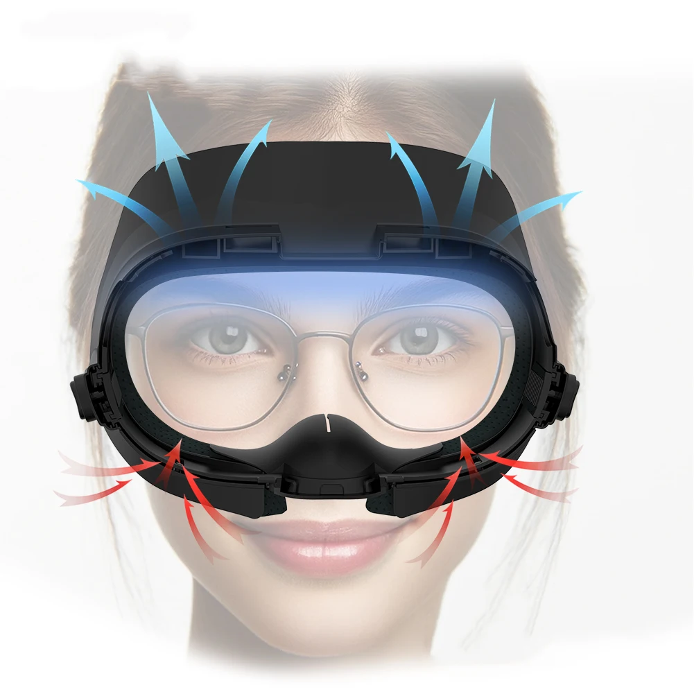 4. Diseño ventilado para reducir la niebla:Nuestro soporte facial de altura ajustable cuenta con una estructura de ventilación única (en la parte superior, inferior y laterales) con un diseño de doble capa que sigue los principios de circulación de aire, asegurando un amplio flujo de aire para mantener la cara fresca mientras usa los auriculares VR. La almohadilla nasal antifugas no solo evita las fugas de luz para una experiencia de juego mejorada, sino que también reduce eficazmente el empañamiento de las lentes, manteniendo la cara fresca y seca incluso durante largas sesiones de juego.