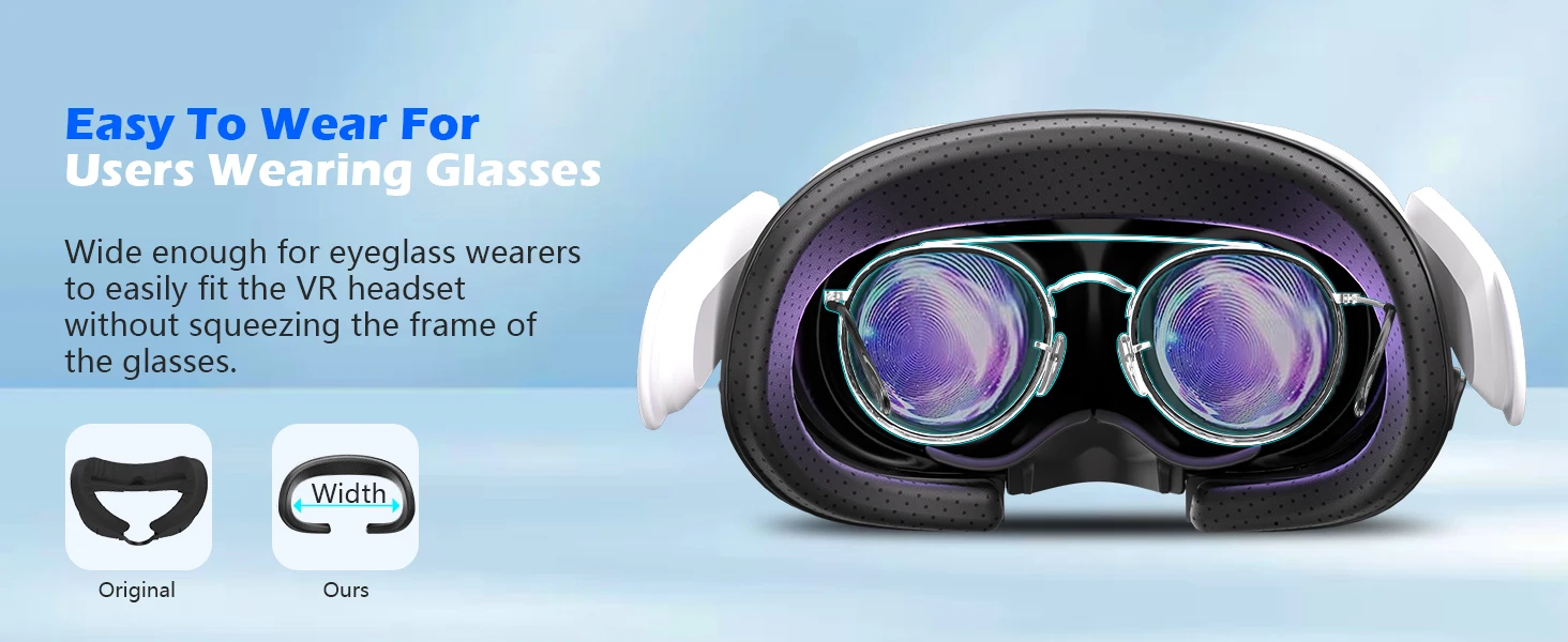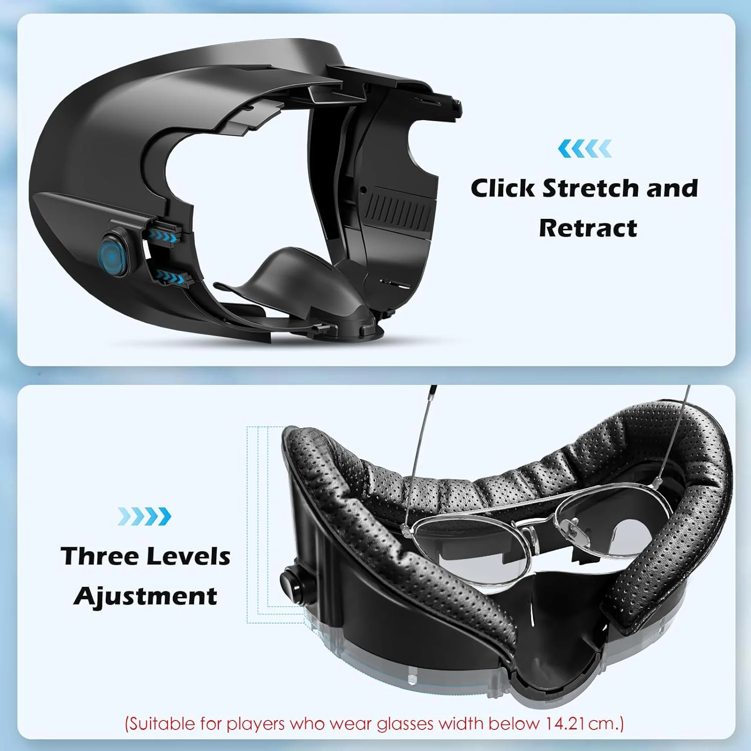 Interfaz facial ajustable con profundidad de 3 posiciones: szkoston diseñado compatible con la interfaz facial Quest3 con dos botones ajustables de un solo clic para ajustar la distancia entre los ojos y la lente en tres posiciones, brindando una experiencia de juego cómoda para jugadores con diferentes formas de rostro y usuarios de anteojos. (ancho de vidrio por debajo de 14.21cm).