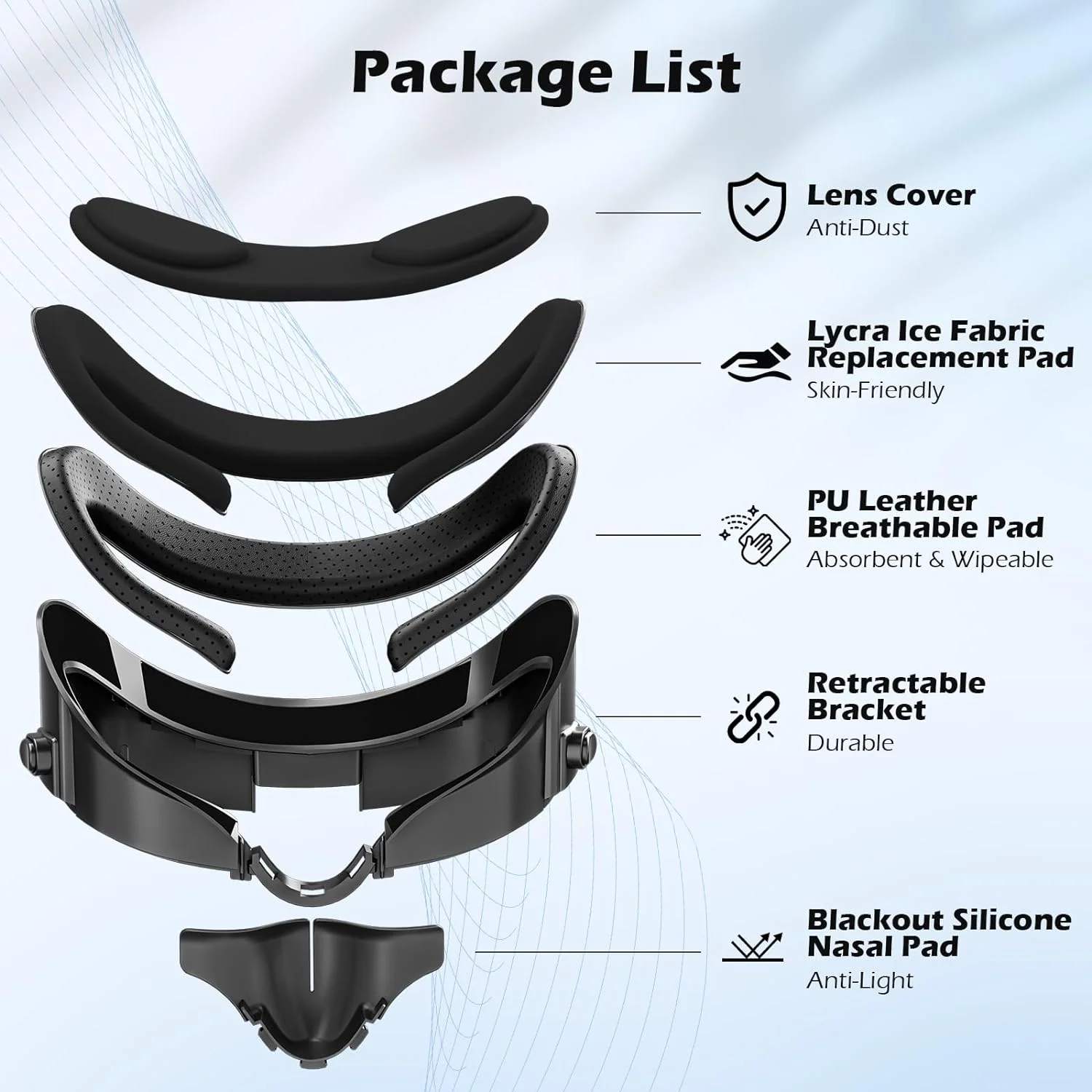 LO QUE OBTENDRÁS: Para soporte de interfaz facial Quest3*1 (con almohadilla nasal opaca*1, almohadilla facial de cuero*1) almohadilla facial de algodón de seda helada*1, cubierta de lente*1, paño de limpieza*1, manual de instrucciones*1. Si tiene alguna pregunta sobre nuestros productos, no dude en contactarnos.